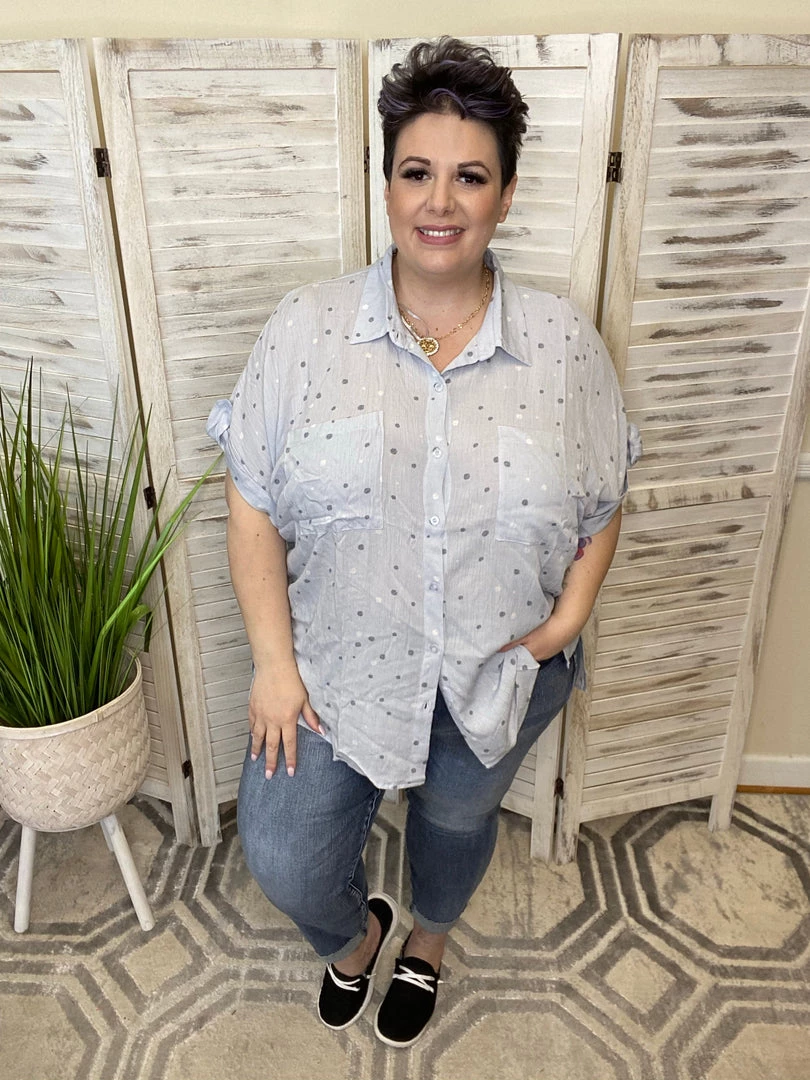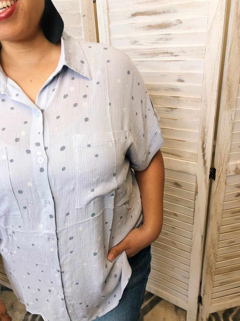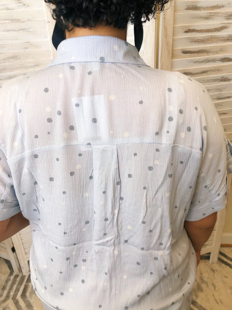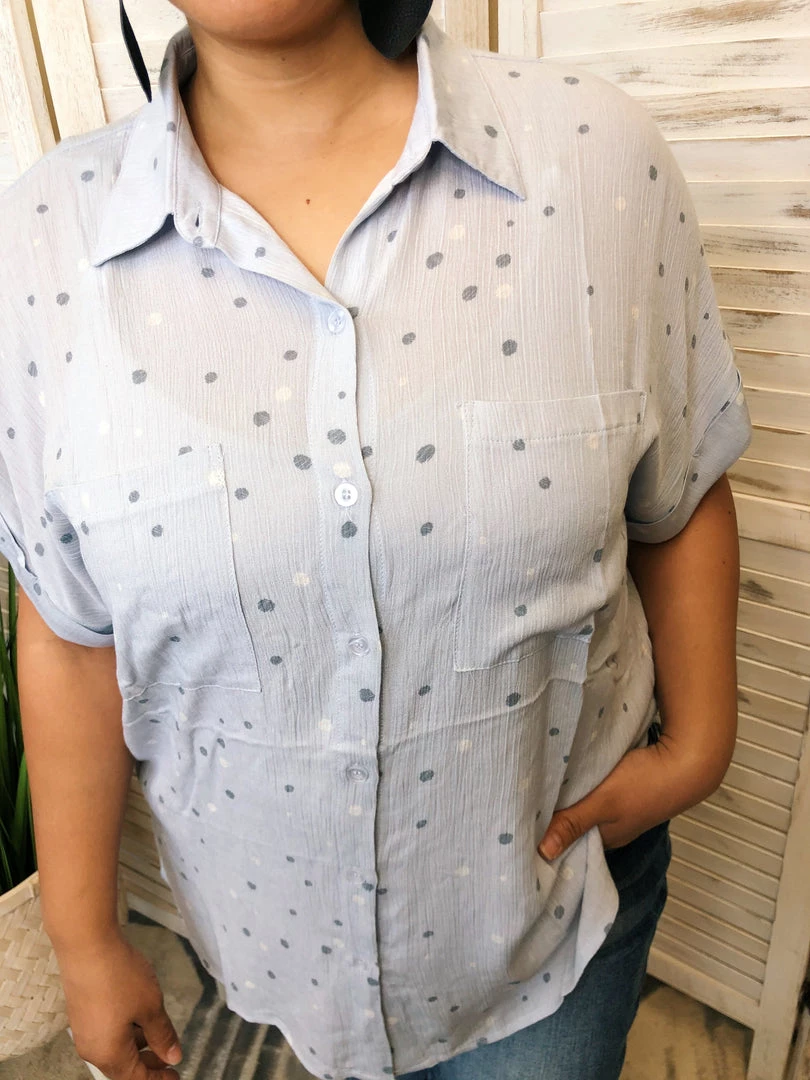 This gorgeous button down top features two pockets, short sleeves and gorgeous polka dots on it. Pair this super flowy and soft with your favorite bottoms for a casual chic outfit!