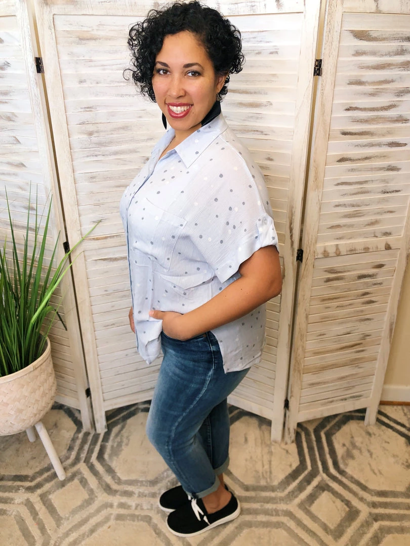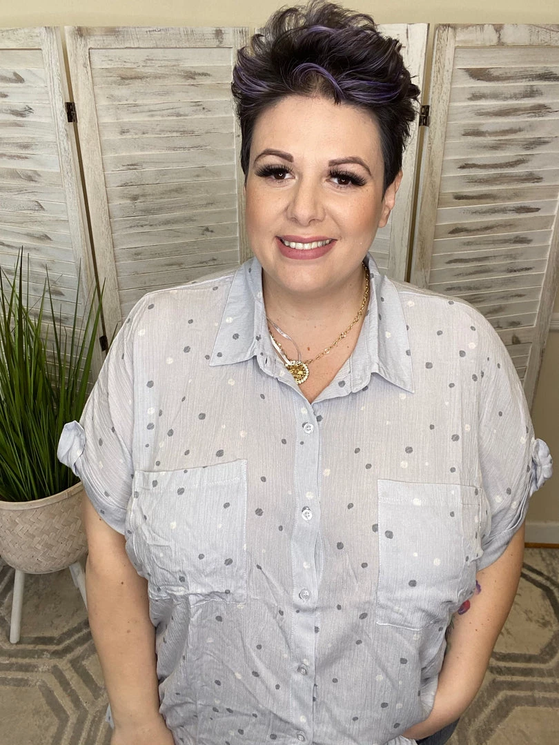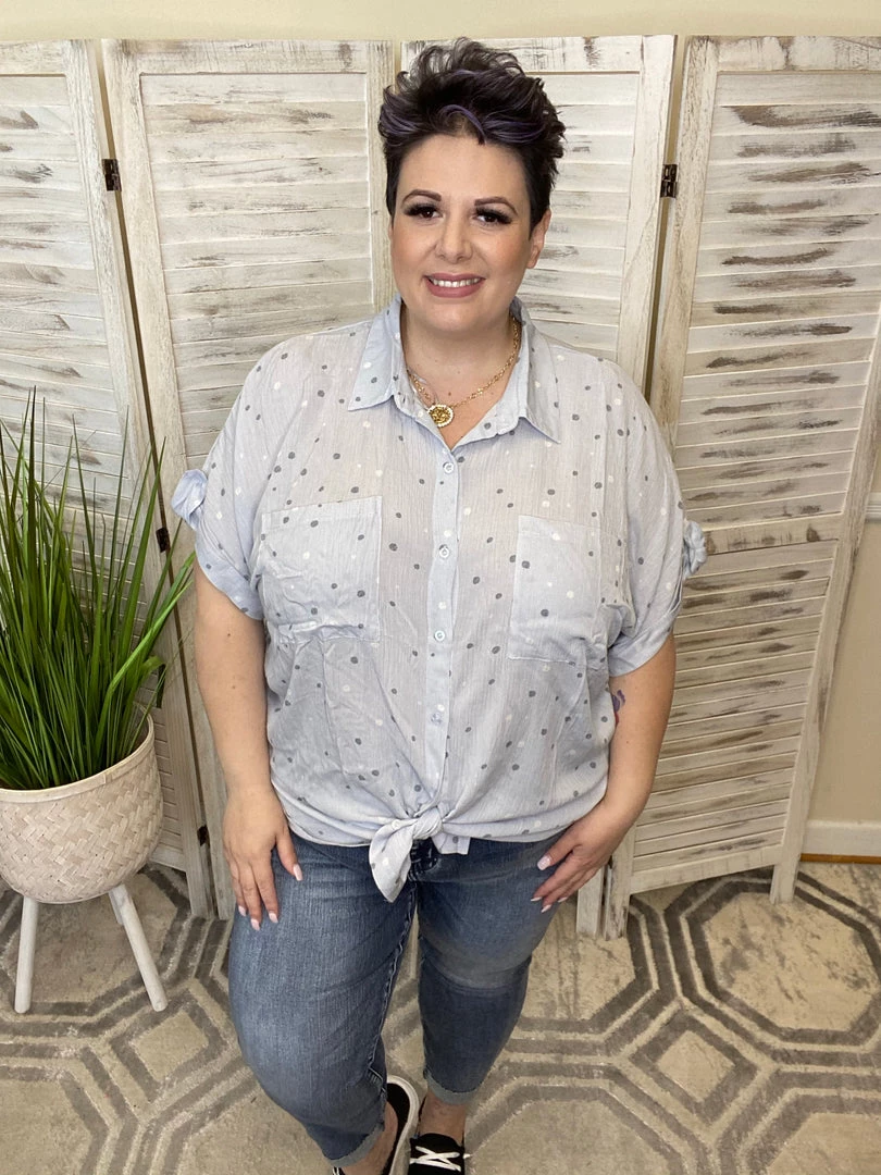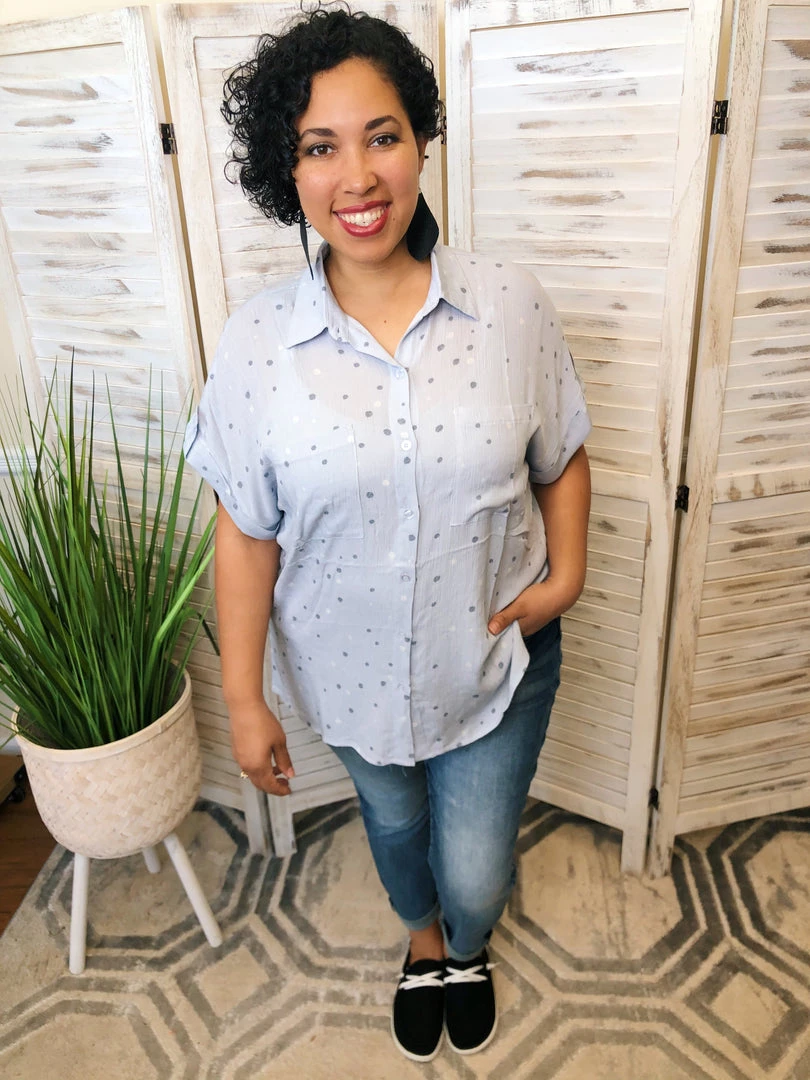 This gorgeous button down top features two pockets, short sleeves and gorgeous polka dots on it. Pair this super flowy and soft with your favorite bottoms for a casual chic outfit!