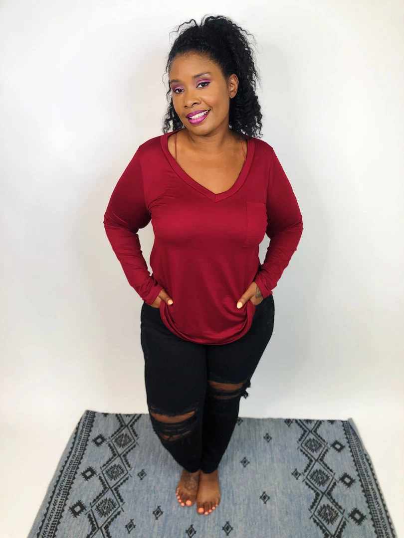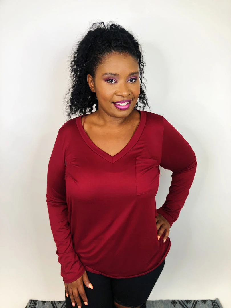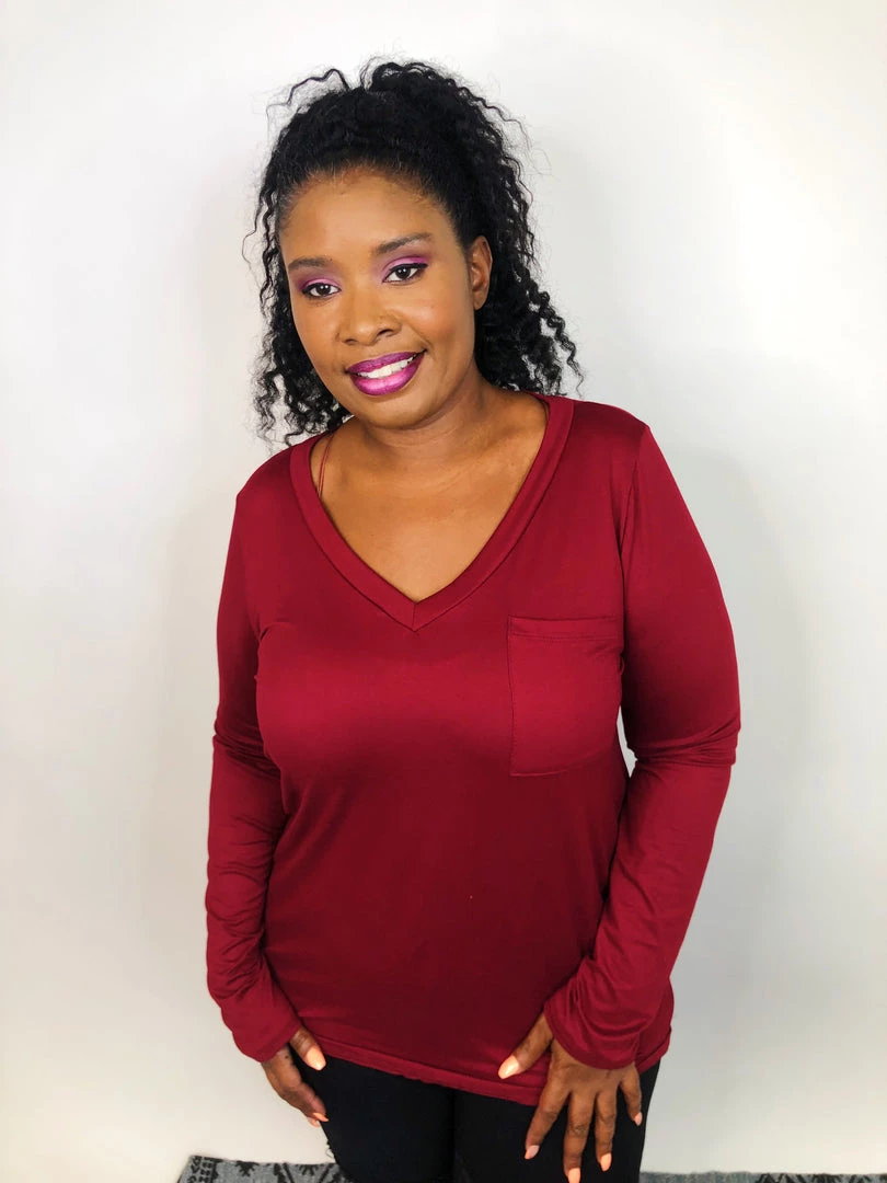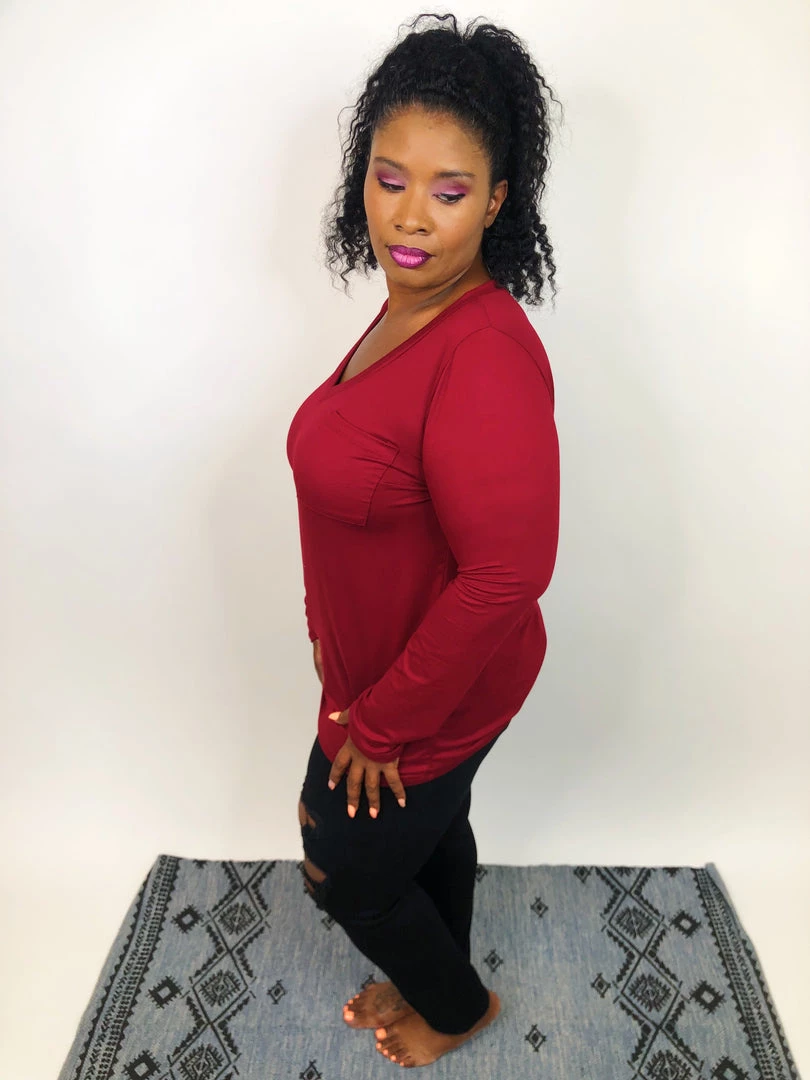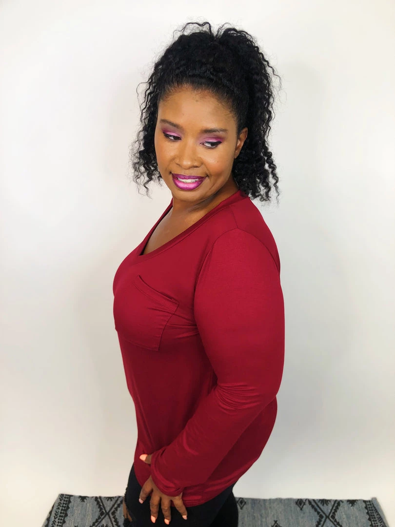 This long sleeve topΒ is simply AMAZING! They are super soft leggings material with a neck line and a chest pocket on one side. This wine color is perfect for ringing in the holiday season! The warm hue is exactly what you need to help you feel and stay warm and cozy this season.This top has amazing stretch and can easily be layeredΒ orΒ wornΒ as is.Β