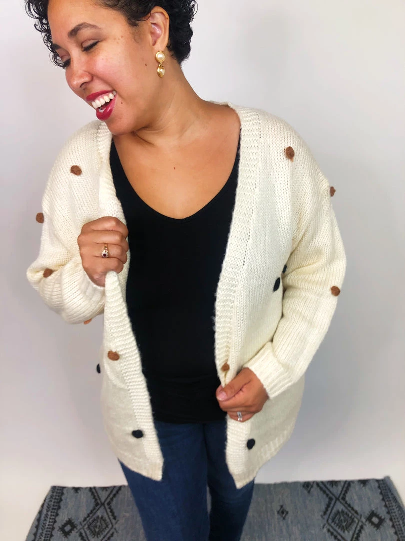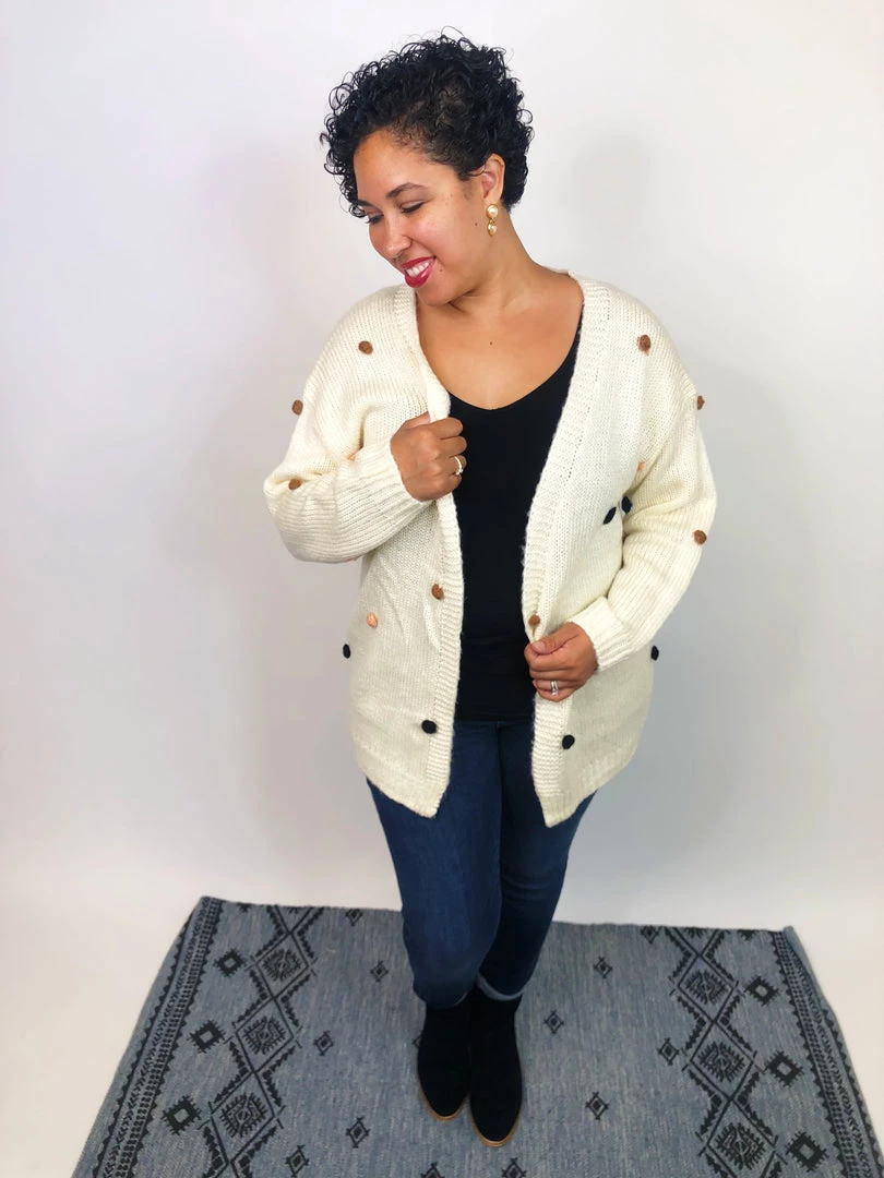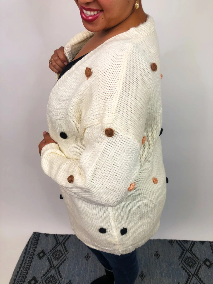 This beautiful sweater is going to be an amazingΒ addition to your fall collection. It’s a fairly heavy sweater with pom pom added to it. The pom pom are different colors and add a little extra. They can stretch and be used with other clothing under.