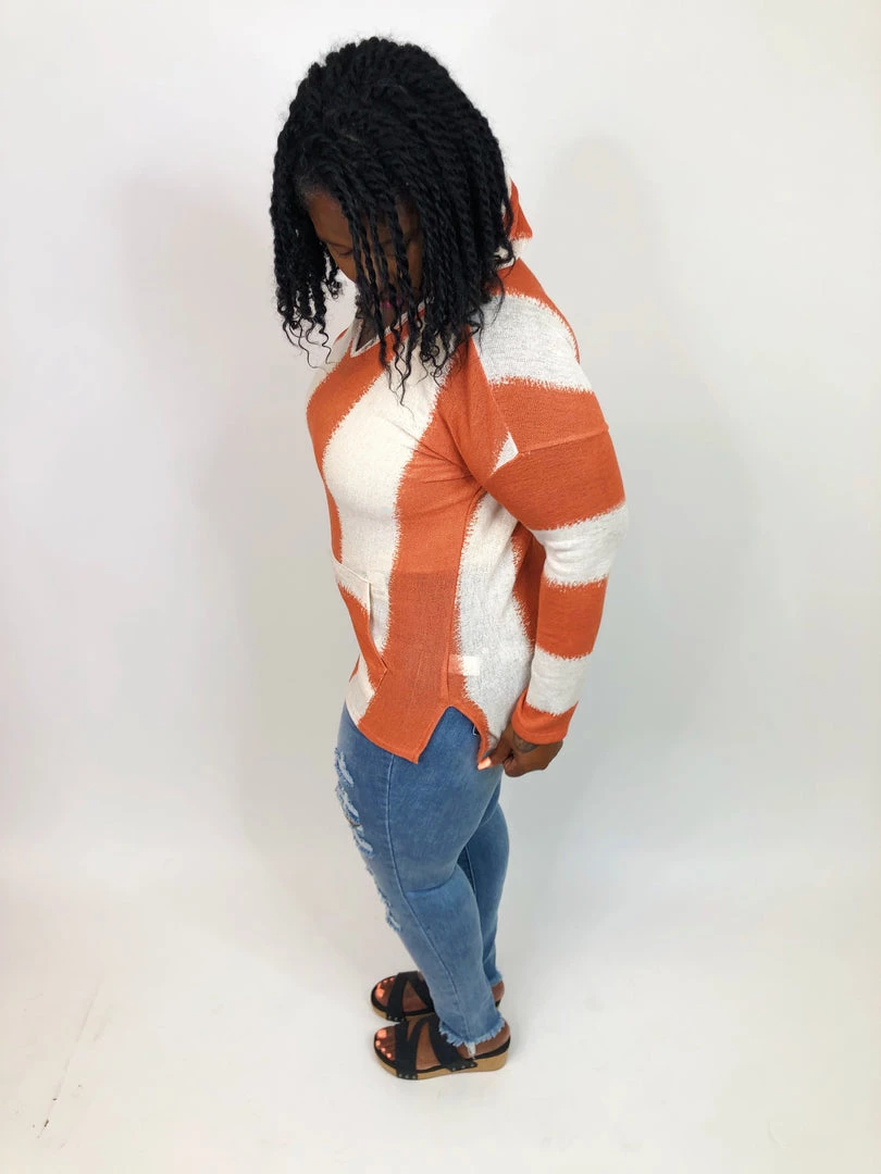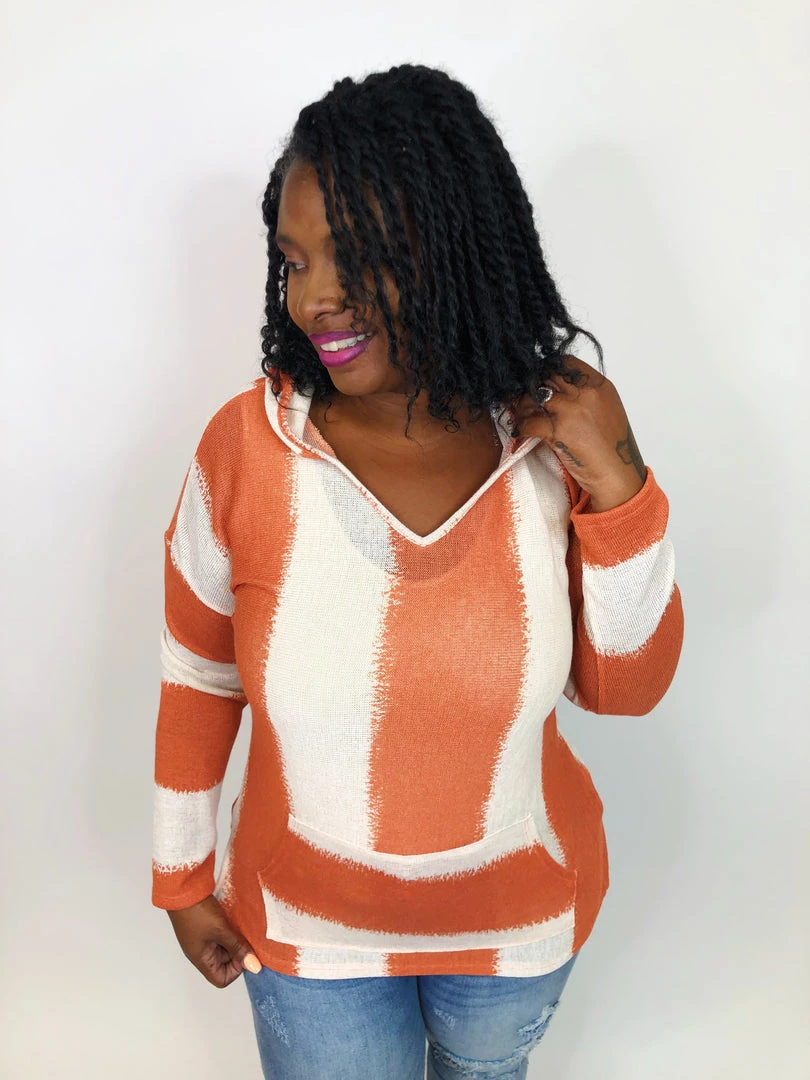 This gorgeous striped hoodie is summer sweater lightweight with long sleeves, a kangaroo pouch and a hood! This lightweight sweater is light enough to be worn all year round! You can easily layer it for the cooler months or leave it as is and wear it with shoes or even over a swimsuit during the summer time. This top has a slight v-neck line leading into the hood. The stripes are cream and rust colored with the sleeves appearing to have stripes going an opposite direction! This hoodie is too cute to pass up!