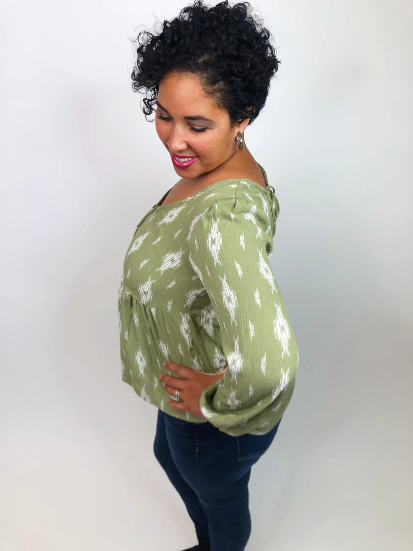 This gorgeous olive colored top feature ivory diamond shapes on it. It has a cinched sleeve cuff and it has rouche fabric on the upper chest area before it flows into the rest of the top! This square neck top is lightweight material that flows without clinging to you.Β