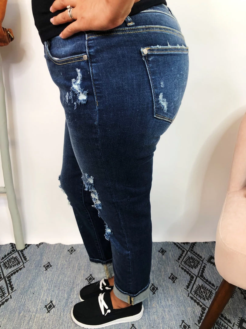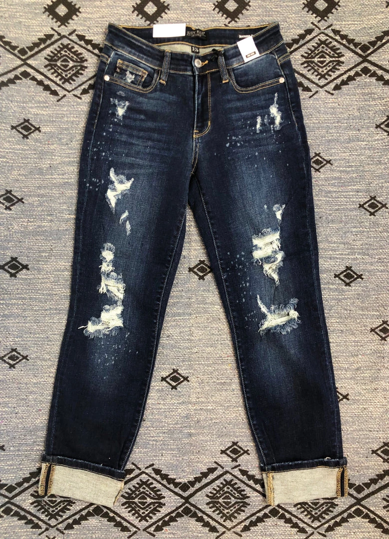These amazing dark wash jeans, are mid rise and boyfriend fit! It features some bleach splash along with the distressed all over the jeans, it’s the perfect match! They are really comfortable since the boyfriend style has a looser fit, and it’s also really stretchy! They are originally cuffed but you can wear uncuffed as well, both ways you will look incredible pretty!! You will have so much fun pairing these jeans into outfits, they are perfect to wear all year around with no doubt!! You will love it!