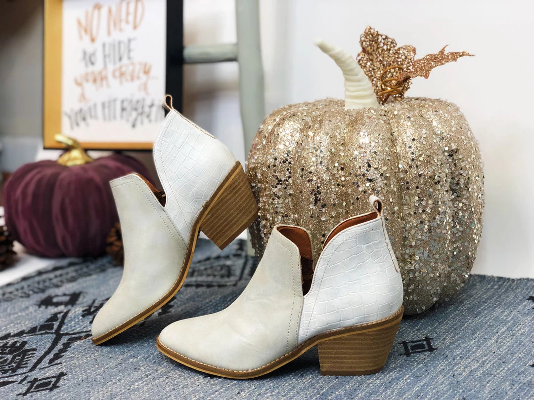 These Boutique By Corkys white metallic boots are gorgeous! These boots feature a 2” heel and a slight V on the sides. The front part of the boot is in a white metallic suede fabric while the back portion is a white snake print that is a few shades lighter than the front; giving it these boots a stunning contrast! The stitching around the boots are stunning and add character. These slip on booties have amazing cushion on the inside. Your feet will feel like they are on a cloud!Β