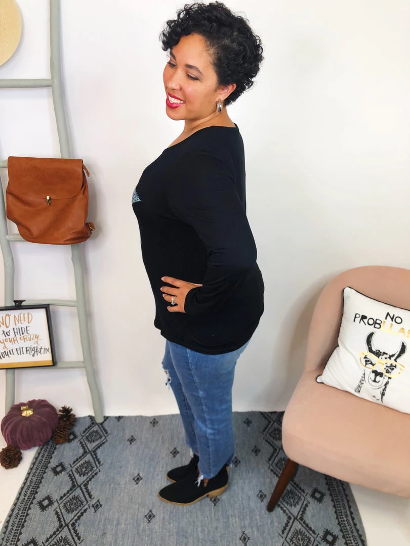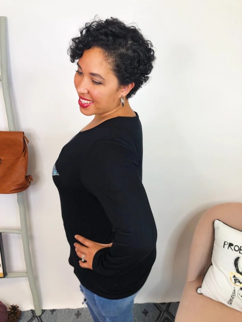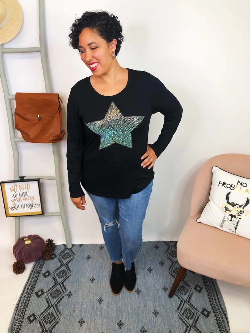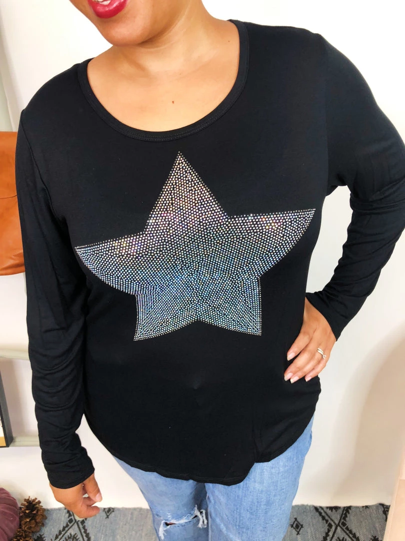 This beautiful long sleeve top it’s really soft and it features a shine star with stones, this top it really stand out. It’s super soft and comfortable, and you can dress down or dress up with this top. Have fun!
