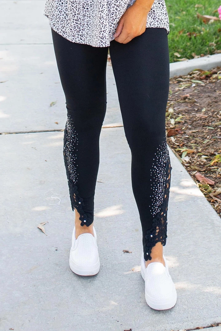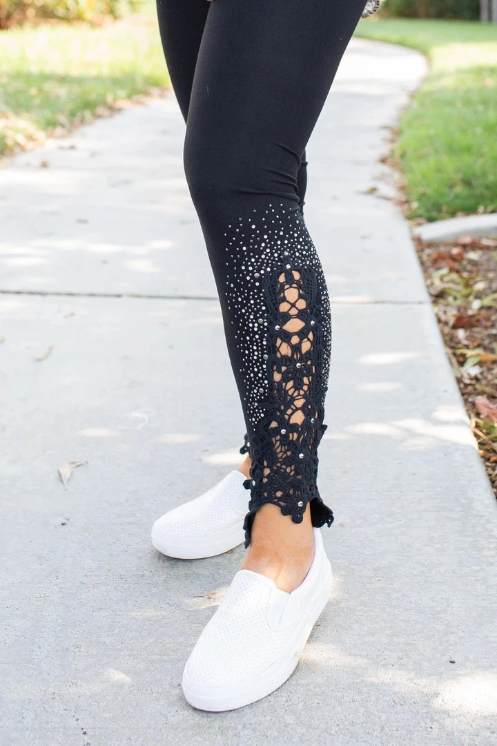 This gorgeous leggings it features the most amazing lace patch along with shine stones on the bottom and that makes this leggings so stunning!! It’s really soft and super comfortable. You can easily pair with any top and you will look ready for it to enjoy the day/night.