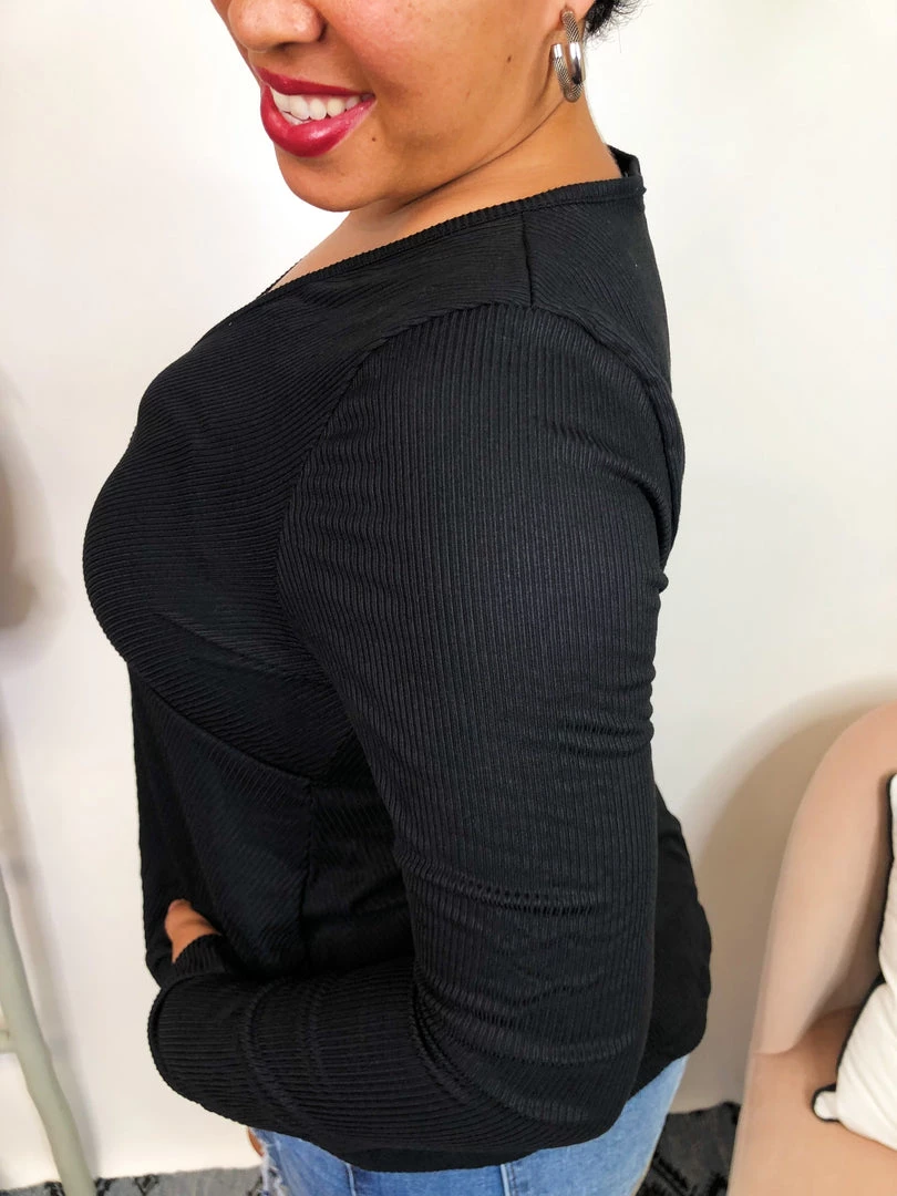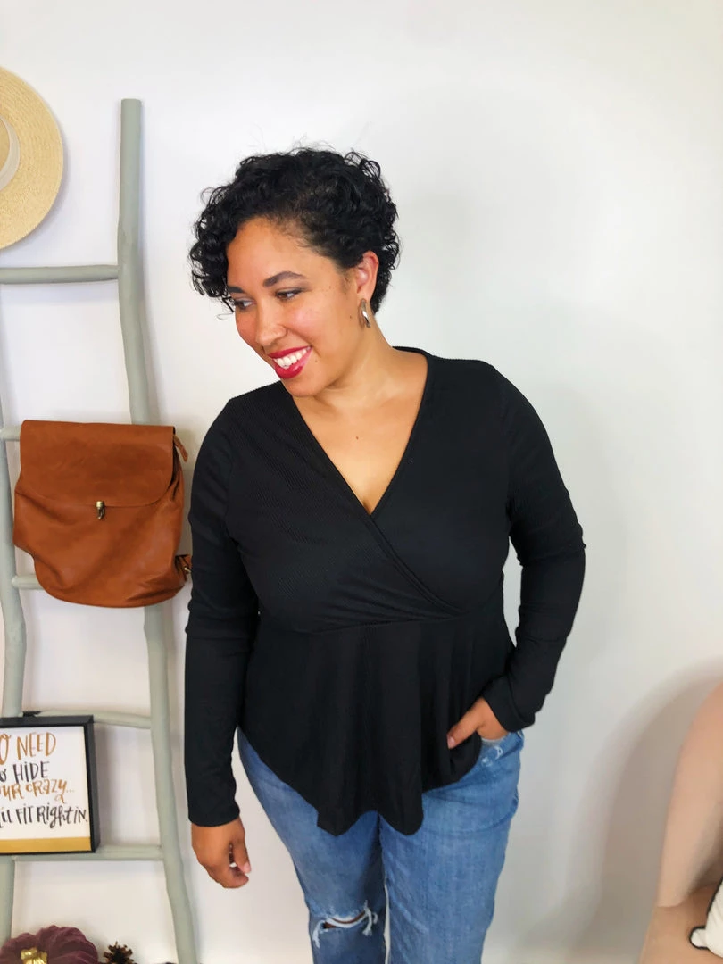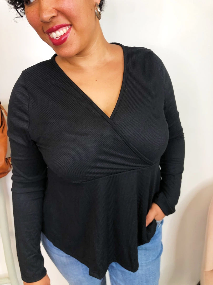 This absolutely adorable babydoll top features a v-wrap front that slightly flairs to accent your gorgeous waist! This long sleeve top oozes comfy sophistication with its ribbed fabric and soft texture. The stretch on this top is AMAZING! Snag this and pair with your favorites booties for an adorable look that can be dressed up or dressed down.