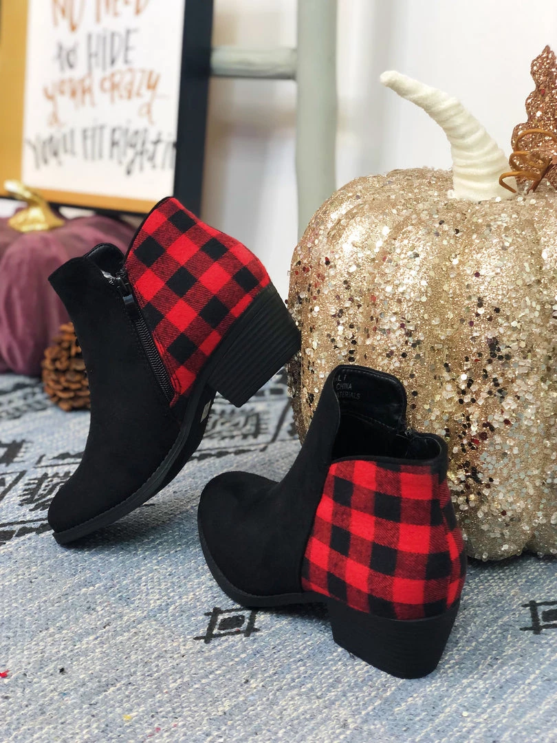 These boots by Boutique by Corkys are absolutely stunning! Who doesn’t love a gorgeous pair of boots and plaid? With the main part of the shoe being black suede and the back pair being a gorgeous red buffalo plaid print cloth, these stunning boots are exactly what you need for Fall and Winter. The size zipper of these boots allow you to easily take them on and off. The low black heel ( 1 1/2” inches!) means these boots are sooo comfortable and match the rest of the boot! The plaid part of the boot is lower than the black suede part- keeping your feet nice and cozy! The inside of the boot has amazing cushion that help your feet happy all day!