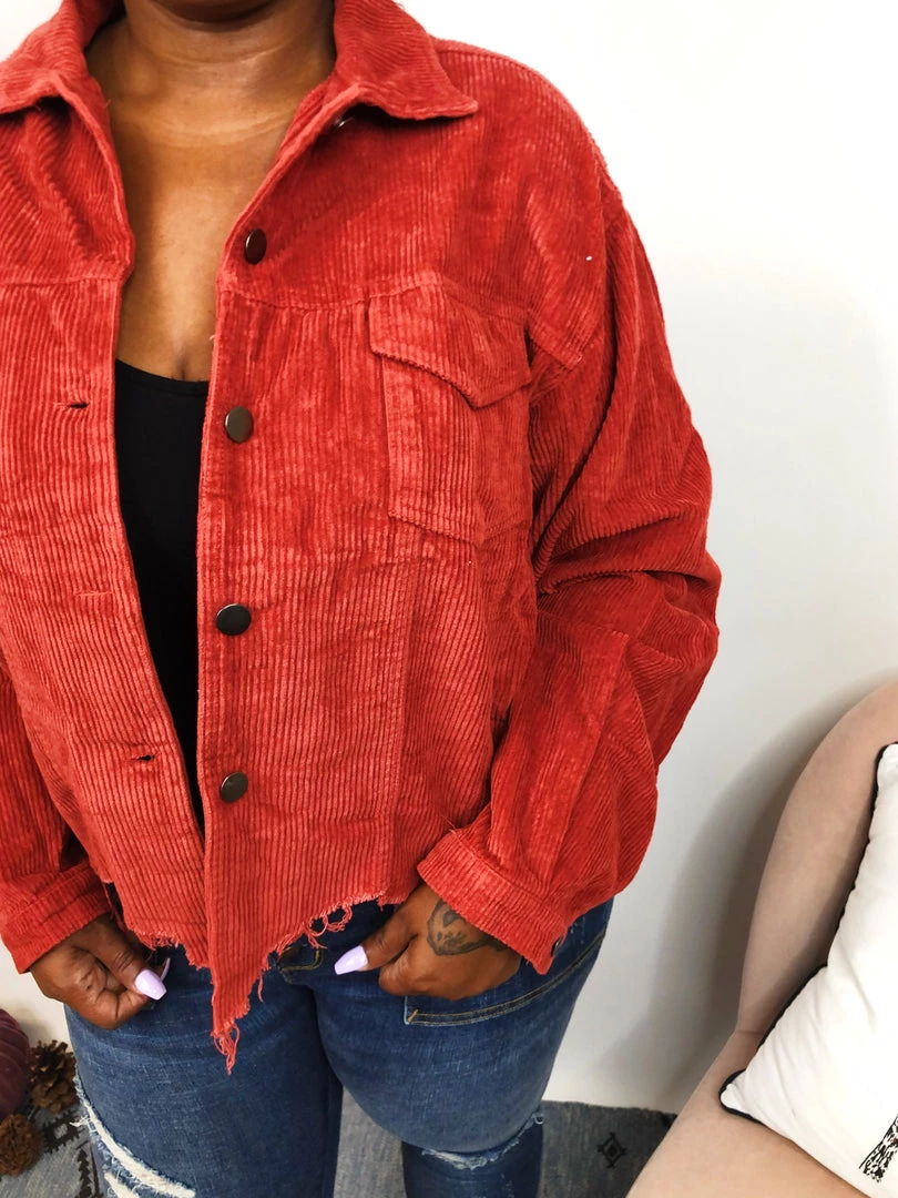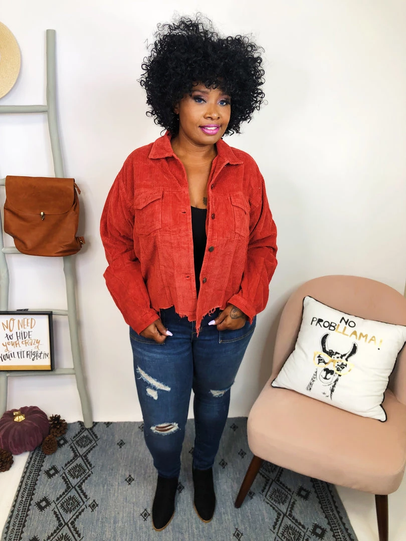 This is such a GORGEOUS jacket!!! It’s really soft and there’s so much details that makes it the perfect jacket for fall, you will love this! It has front pockets, silver buttons and a super cute raw edge detail in the front that makes this jacket a cropped style but with 23 1/2 length, so it’s not too short and you can easily wear during fall time, this will make your outfits really stand out!!! All of that without mention this awesome red color that is just PERFECT!! You can pair this jacket with jeans and cute boots/heels and you will have the cutest and comfy outfit ever!