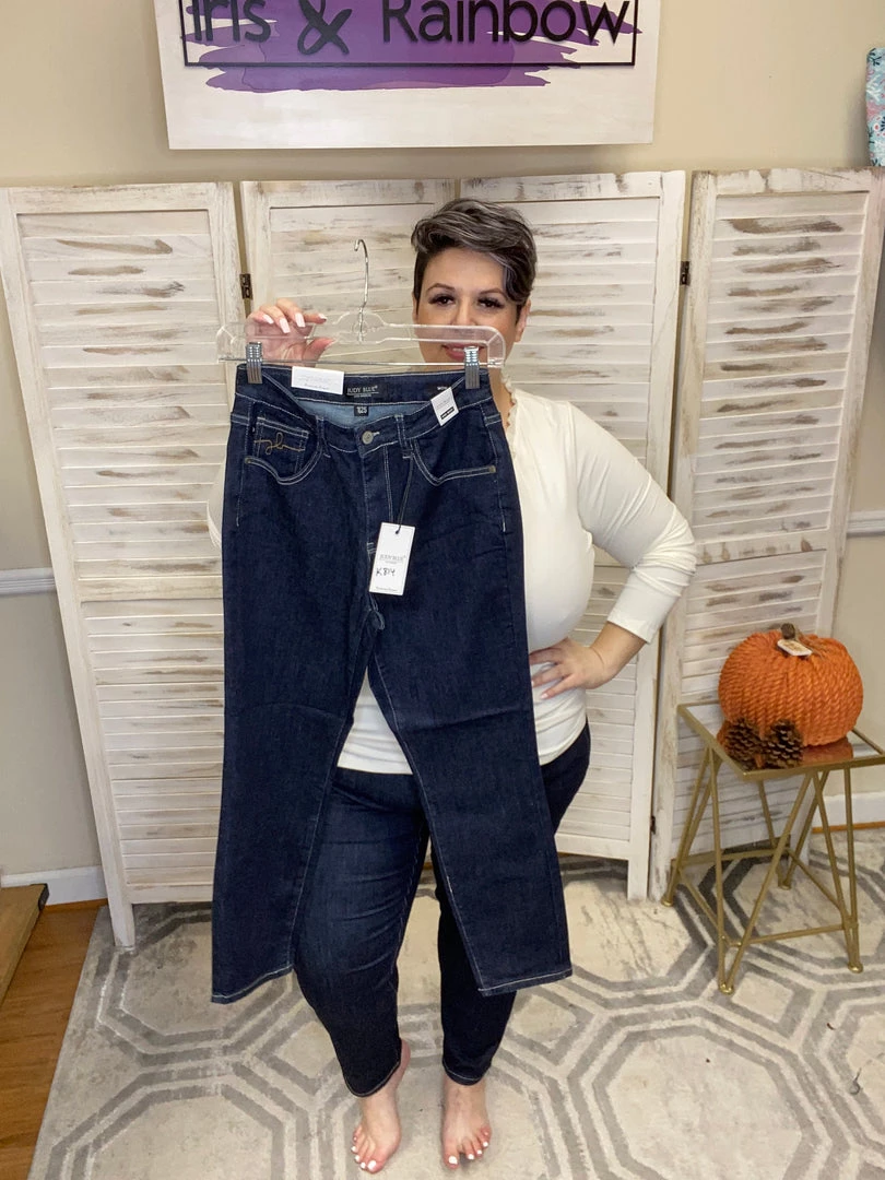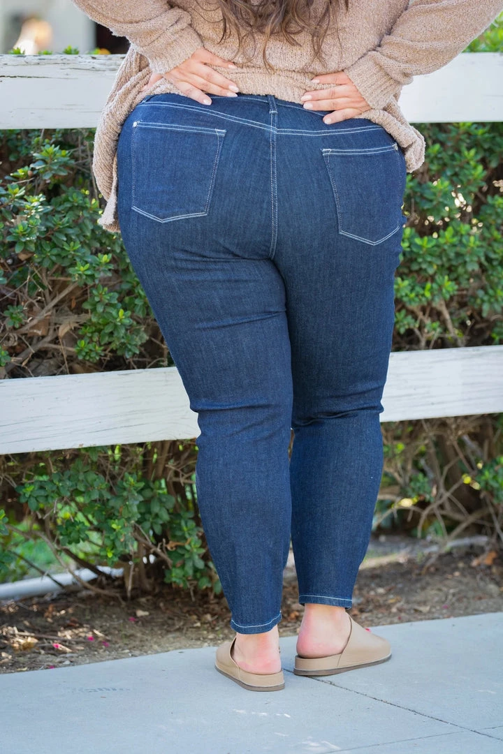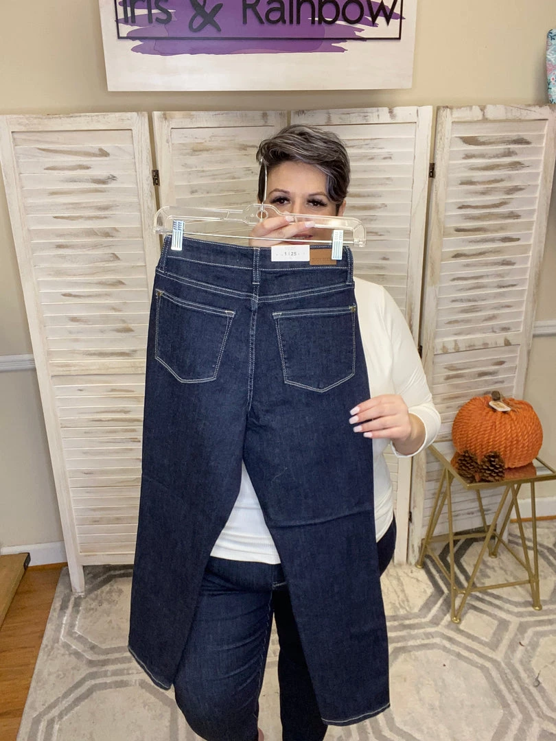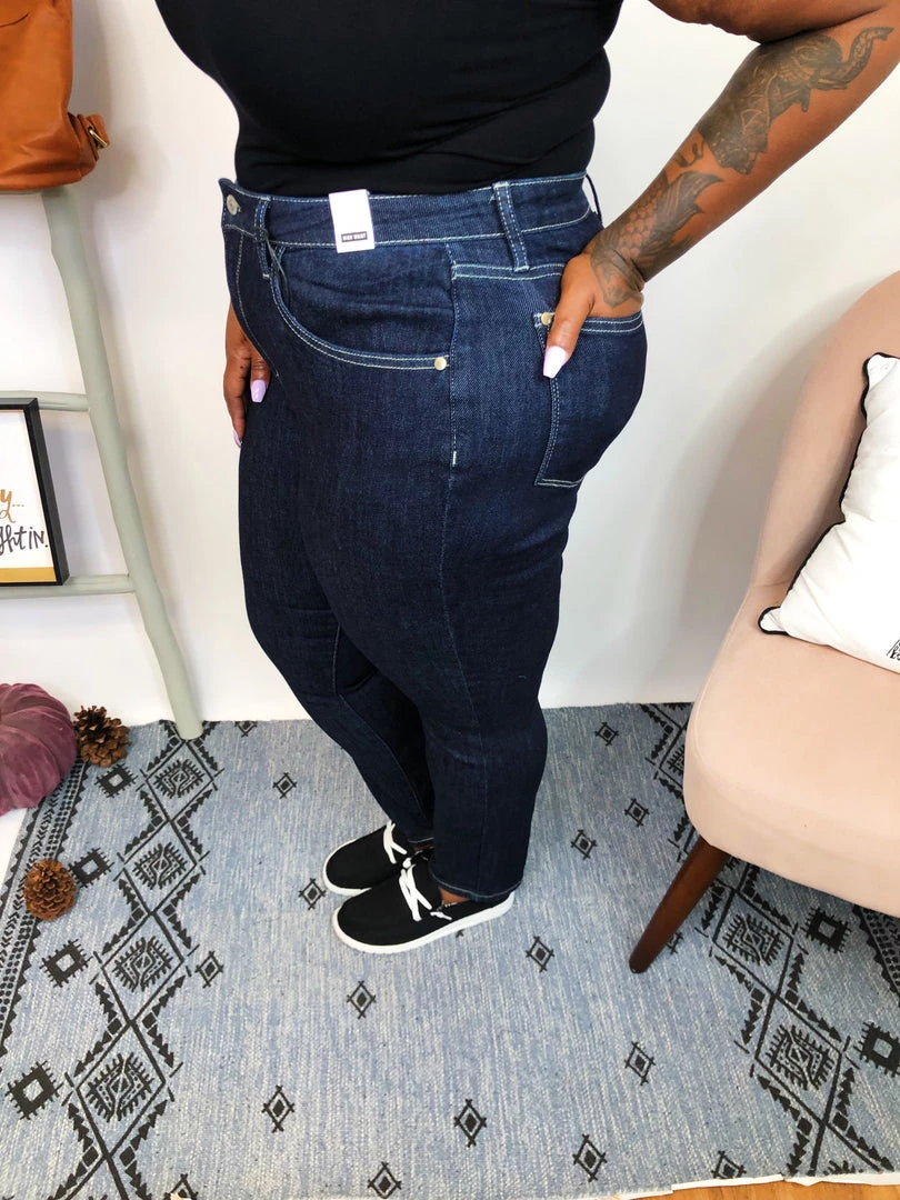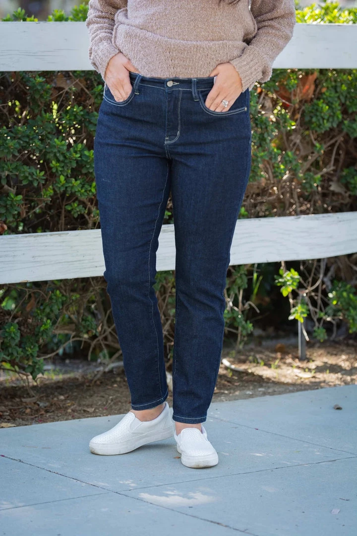 These dark wash Judy Blue high waisted mom jeans are perfection! They have that classic and amazing Judy Blue four way stretch that makes them so comfortable. They have a lighter thread that lines the jeans to add a delightful pop of character and the dark wash is completely solid- no lighter wash present in these jeans!