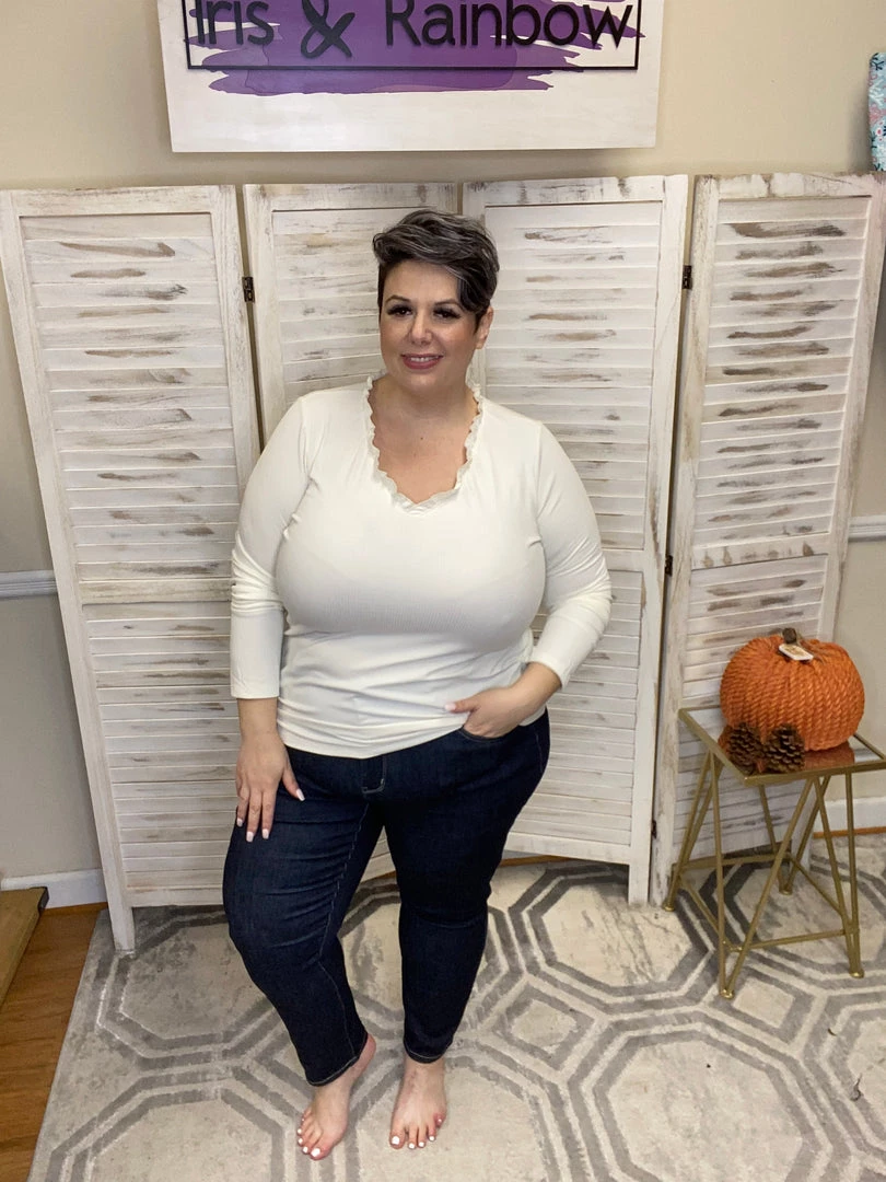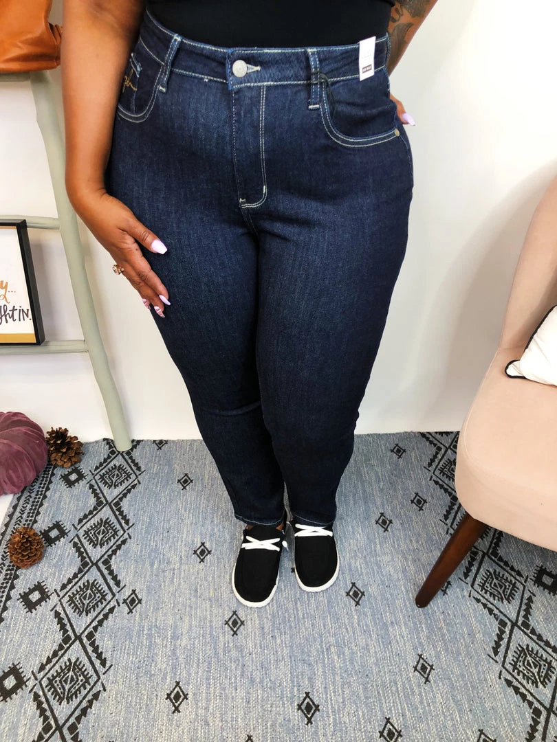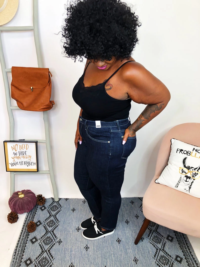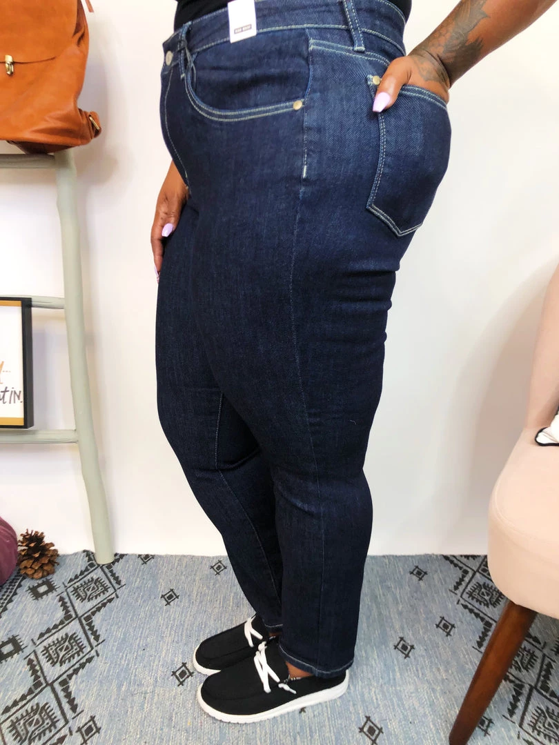 These dark wash Judy Blue high waisted mom jeans are perfection! They have that classic and amazing Judy Blue four way stretch that makes them so comfortable. They have a lighter thread that lines the jeans to add a delightful pop of character and the dark wash is completely solid- no lighter wash present in these jeans!