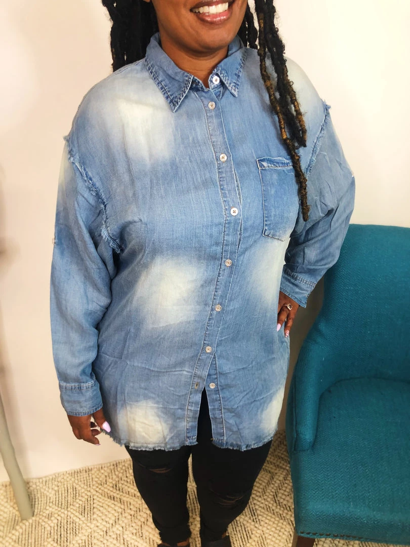 This gorgeous denim tunic top is so incredibly soft, you will never want to take it off! With it’s raw frayed hem at the bottom and exposed edging, this unique top has character and is so much fun to dress up or down. You can wear this buttoned up or unbuttoned. Snag this and have a classic denim top that you will love!
