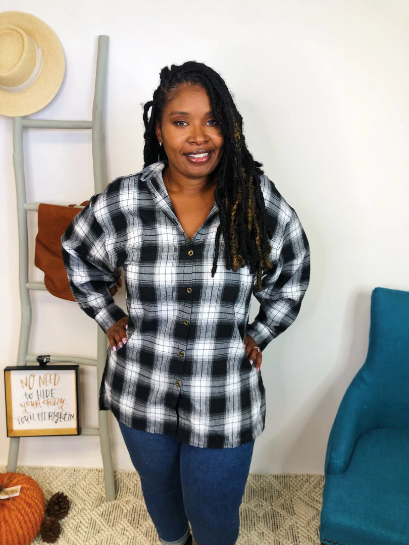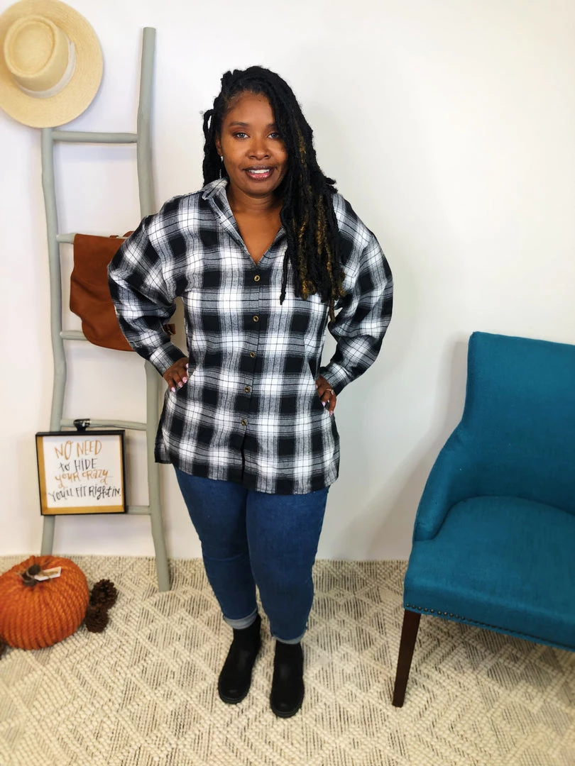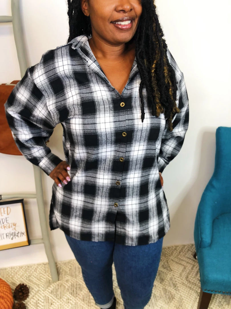 This amazing plaid top is so cozy with its white and black print and button down front. The sleeves have a button on the cuff so you can roll them up or leave them full sleeve and the collar is sophistication personified! The top has more length in the back than the front and is tunic length. You can easily pair this with leggings or your favorite pair of bottoms for an effortlessly chic look!