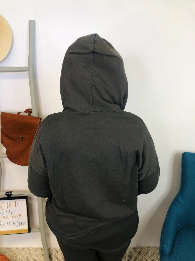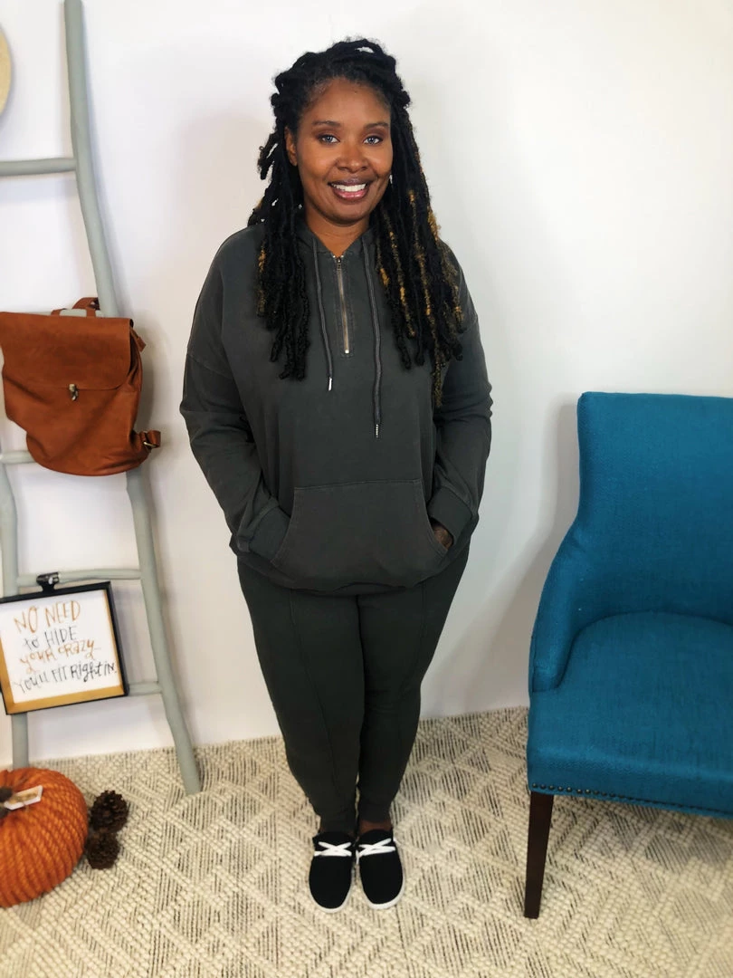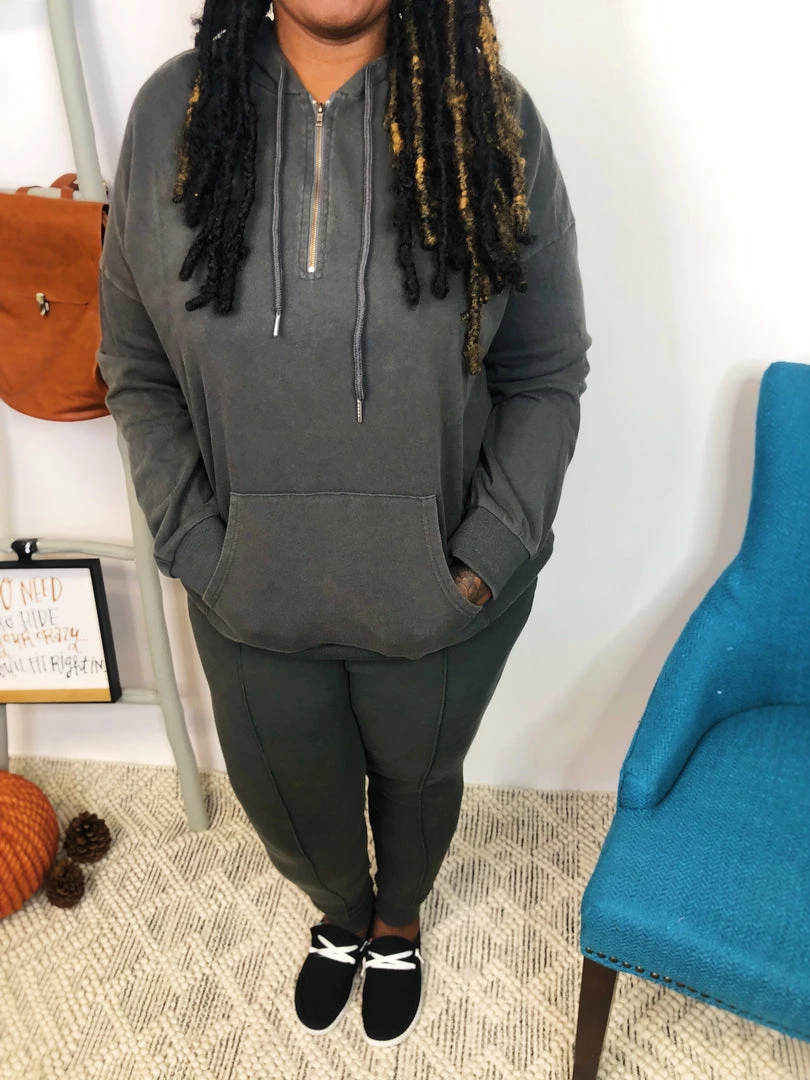 This gorgeous charcoal hoodie is so incredibly soft and has a half zip down the front. It also has drawstrings on the hood to help you achieve that perfect fit! The inside is made of a soft French Terry fabric so it is lightweight while also keeping you warm and cozy. The cuffed and hem line are ribbed to add a dash of character to this simple and perfect hoodie.