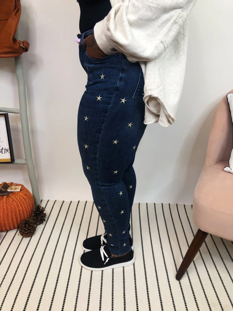 These gorgeous star embroidered Judy Blue jeans are high rise and dark wash. They feature small stars embroidered on the jeans and a raw hem so you can easily cuff these or leave them as is. These non-distressed jeans have Judy Blue’s signature AMAZING stretch! Snag these gorgeous jeans while you can and be the star of the show!