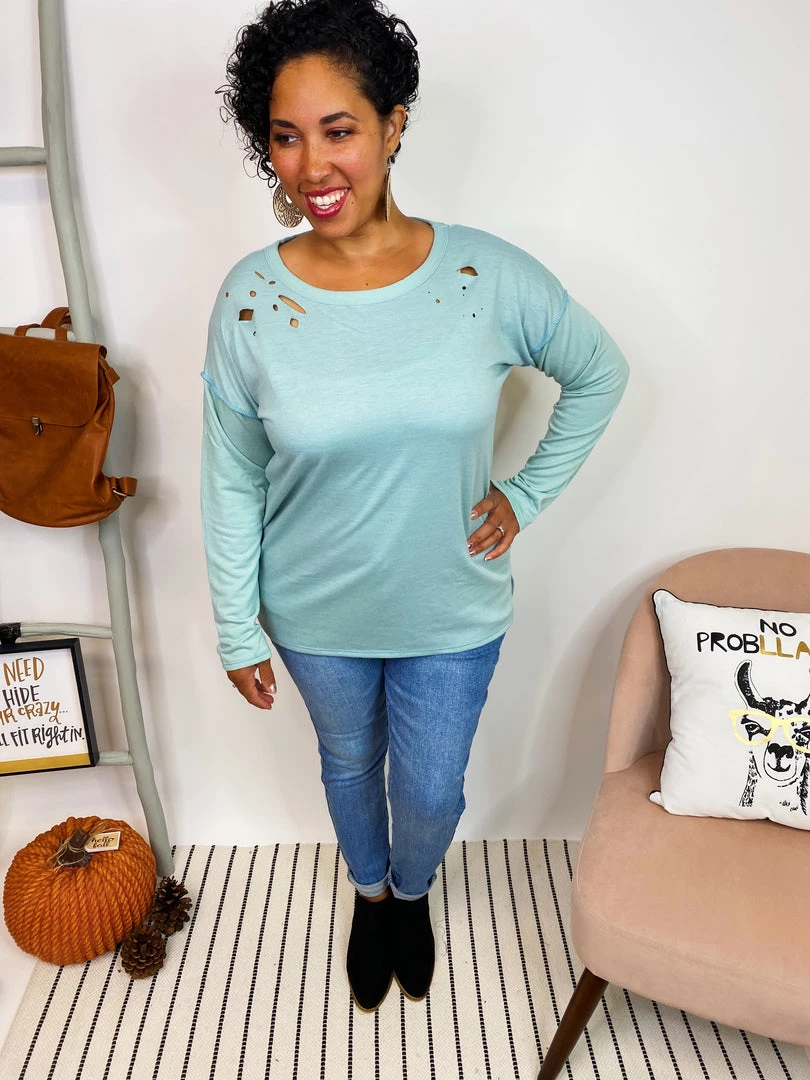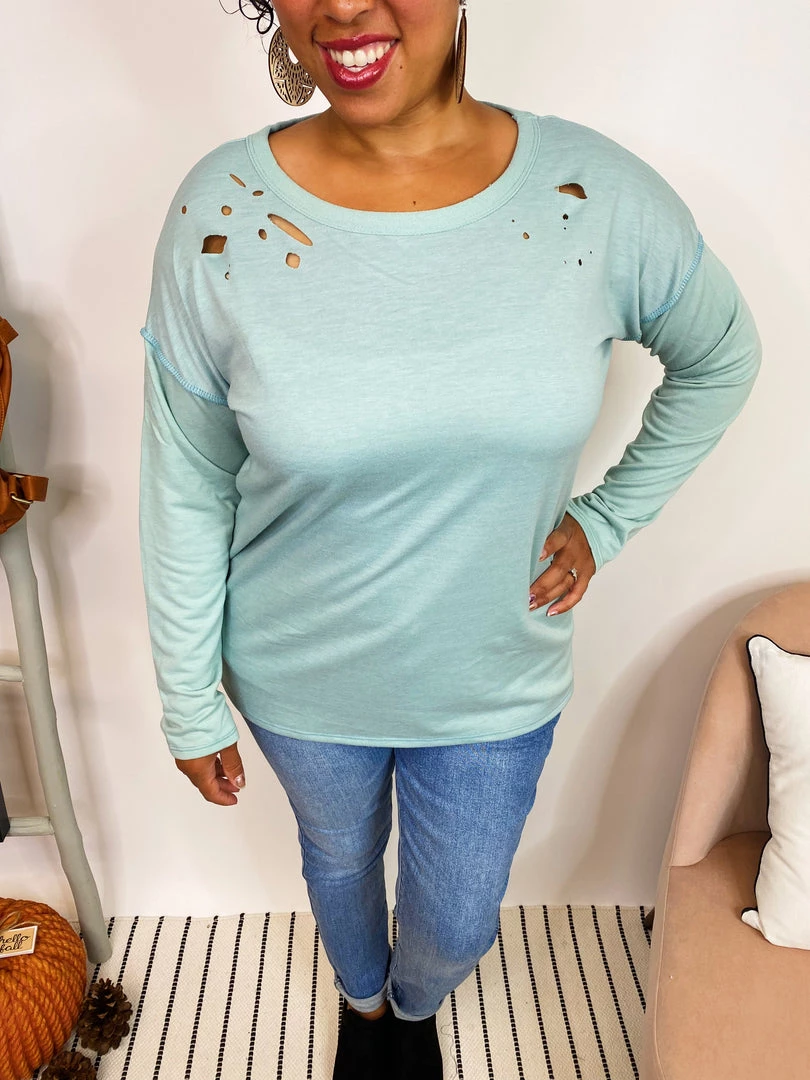This gorgeous long sleeve top, it features laser cut holes at the shoulders and a inside out hem detail also in the shoulder. The light material makes it this top super comfortable and cute. The beautiful sage color it’s just perfect for any casual outfit and you can easily pair it with leggings, shorts or your favorite jeans and you will have a really chic outfit.Β