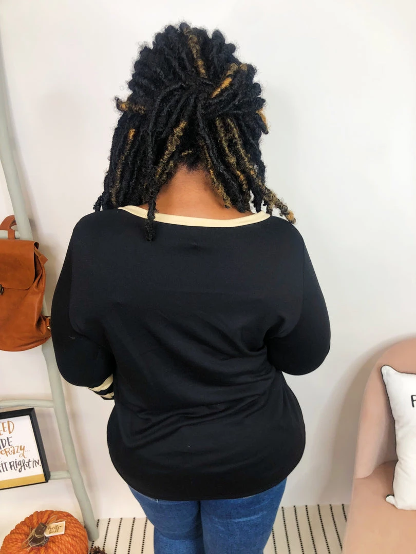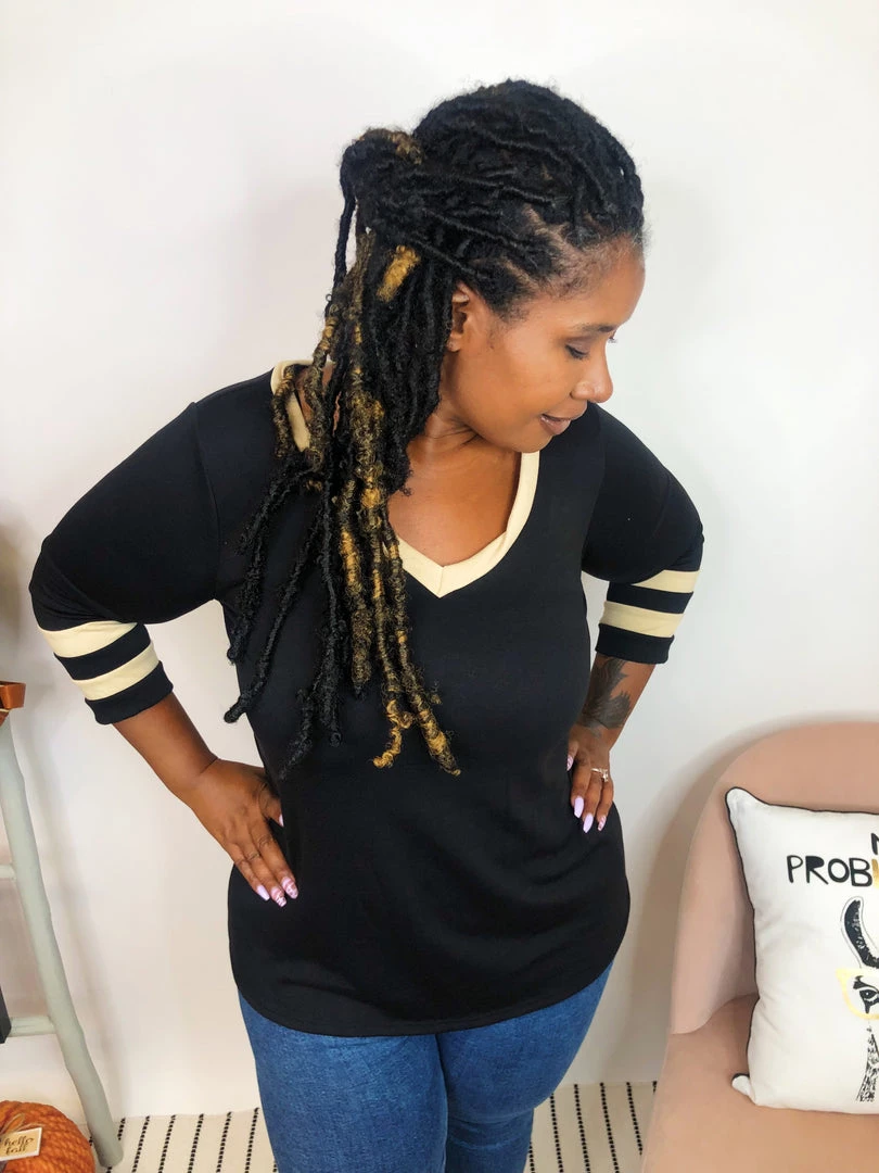 This gorgeous black 3/4 sleeves top, it’s really soft. It features beige color details on the V-neck and on theΒ bottom of the sleeves. This top has a really nice flow and that makes it really comfortable to wear. The black color makes it easy to pair it with anything, and the details on beige color will give a really nice light to your outfit.Β