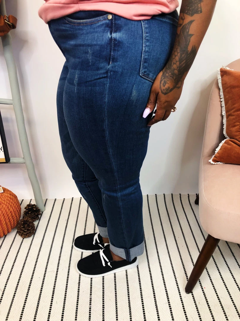 These amazing dark blue Judy Blue jeans are mid rise and the favorite style at the moment: Boyfriend fit! Super comfortable and with an amazing stretch!! They are originally double cuffed, but you can also wear them as uncuffed and they will be a long jeans, and either way they will look gorgeous!! It features some really light distressed and a raw hem in the bottom. These jeans are great for any occasion, you can pair with definitely any top and you will look amazing and super comfortable.