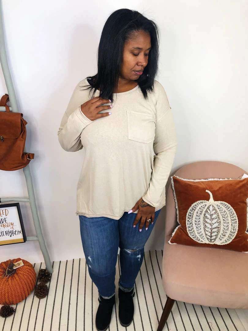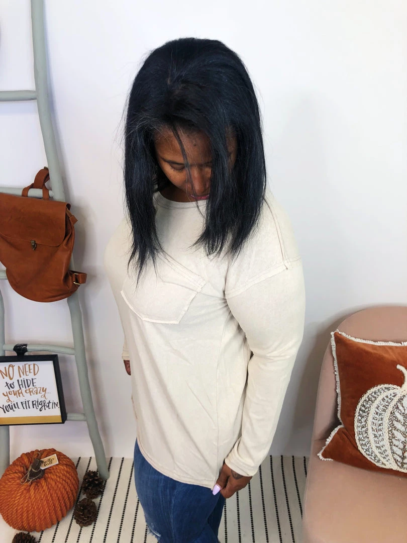 Gorgeous beige long sleeve top. It features raw hem and a front pocket as details. Crew neck and it’s a really comfortable top and the beige color makes it’s perfect for fall/winter outfits and you can pair this top with leggings, joggers or your favorite pair of jeans, and you will have a really cute and casual look.