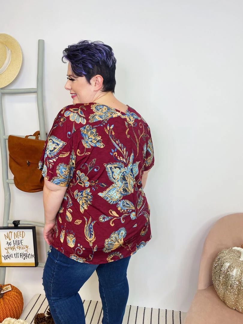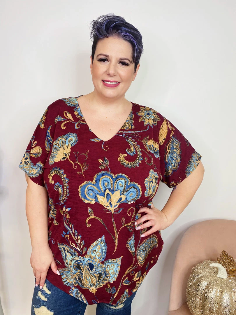 This beautiful top is going to be your go to this fall. It’s a beautiful burgundy top full of teal colored flowers surrounded by golden details. Which gives a much more detailed look, making those teal flowers almost look like a glass flower.Β