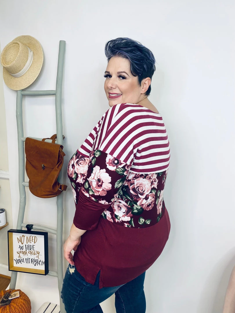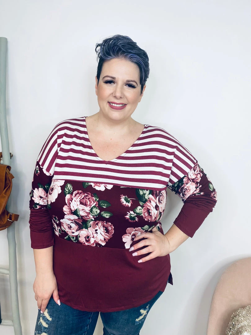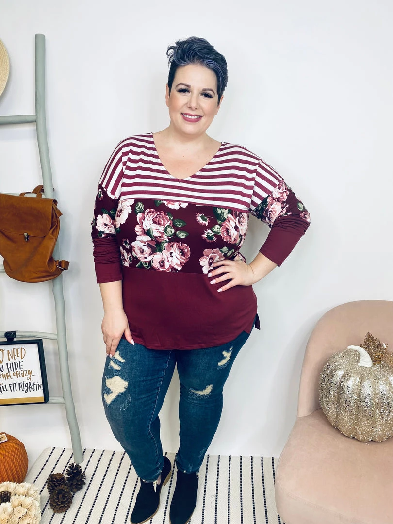 Β This amazing Long Sleeve top is gonna be your favorite long sleeve to wear at night for some smores and relaxing nights. It is divided in 3 sections stripes, flowers and bold colors. Will go great with leggings or jeans.