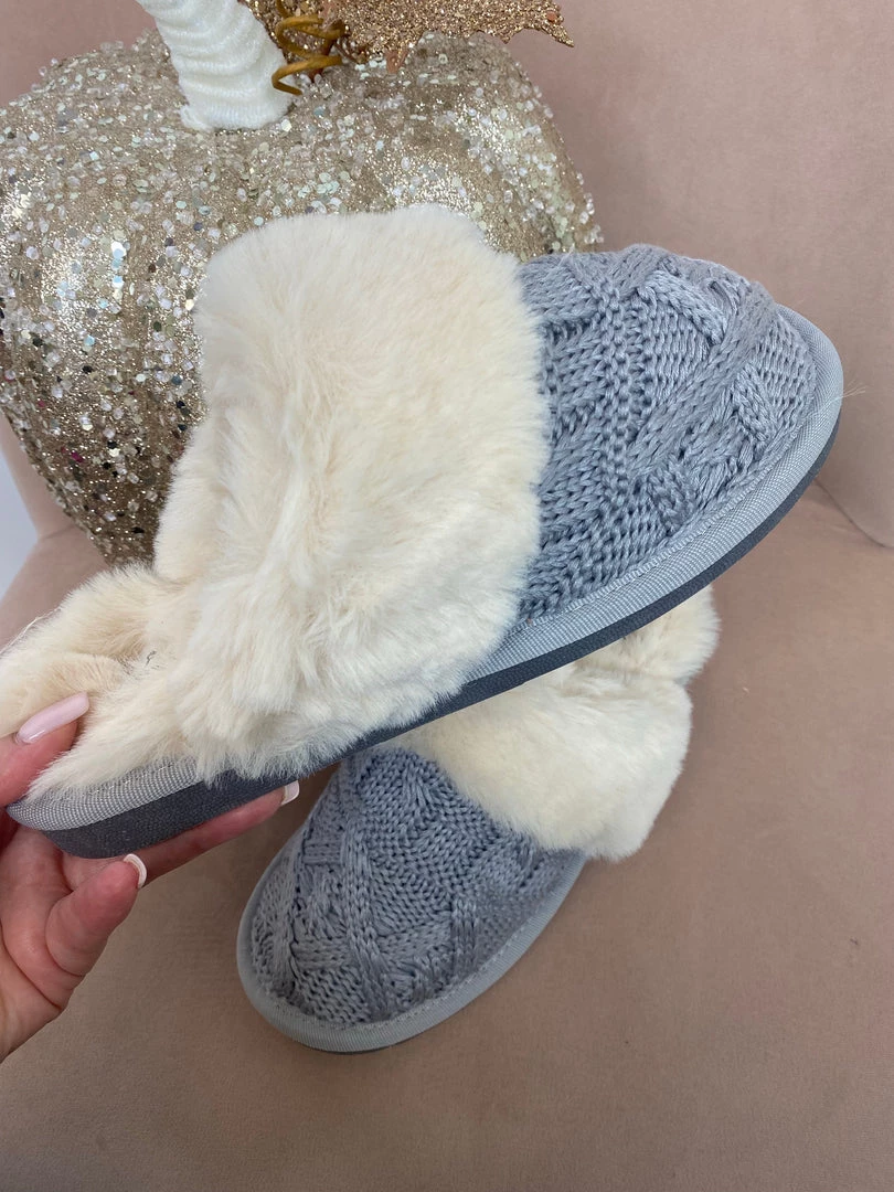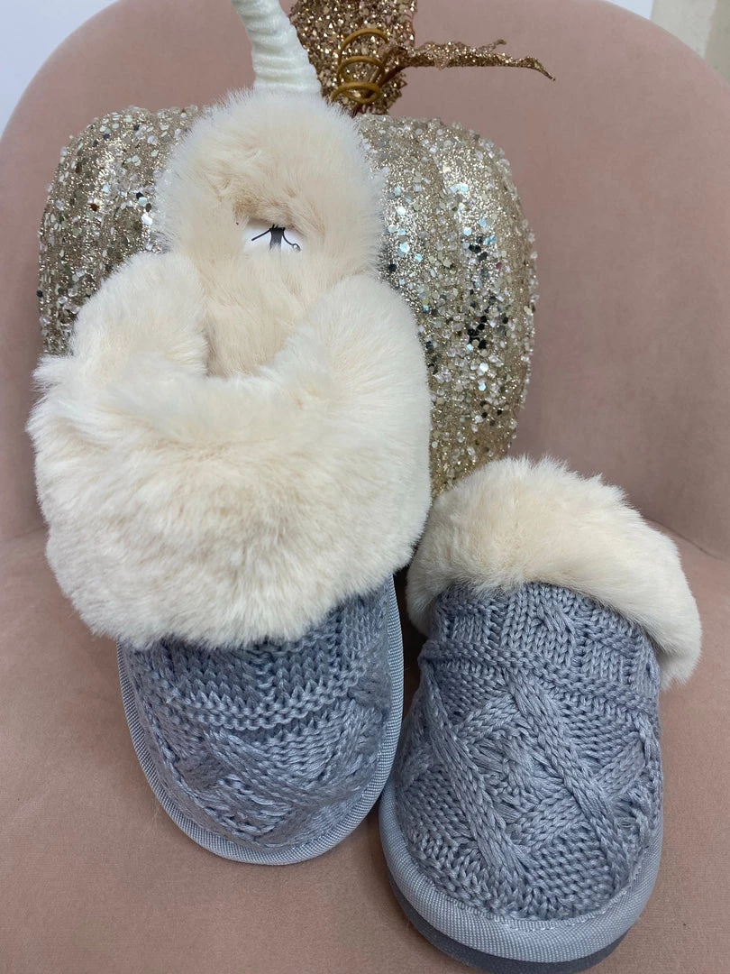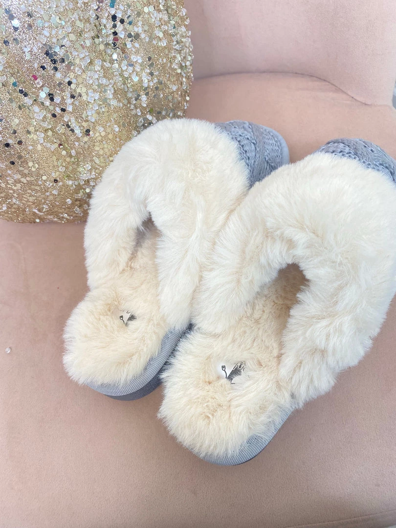 These amazing grey slippers by Corkys feature an ivory faux fur on the inside and woven grey fabric on the outside. These slippers are so soft and cozy. The inside has amazing cushion that keeps your feet comfortable all day. The bottom of the slippers are hard to provide foot support. These slippers are absolutely incredible!
