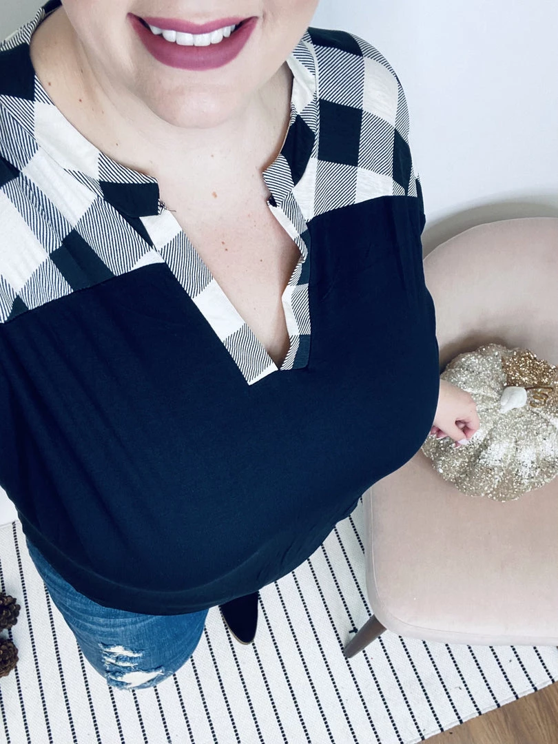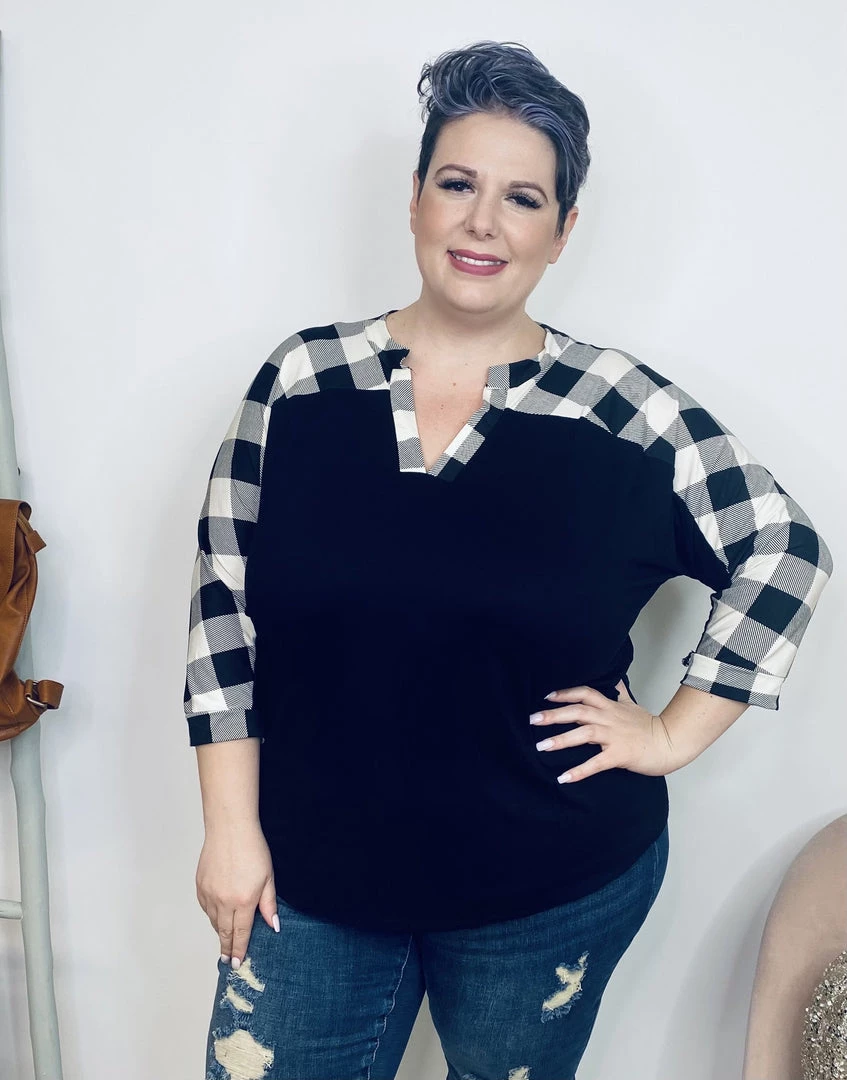 This beautiful 3/4 sleeves top, it features a cute V-neck in the black and ivory plaid that goes all the way to the sleeves. It’s a light and soft material, that it will make you feel so comfortable and looking good as always. Perfect to wear all year around the different seasons. You can pair this top with leggings, shorts or your favorite jeans and you will have a super cute outfit.Β