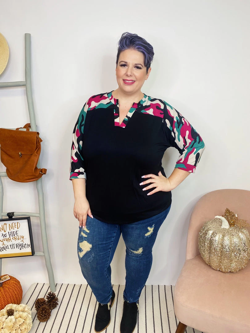 ThisΒ gorgeous 3/4 sleeves top, it features super cute V-neck inΒ camo fun colorsΒ that goes all the way down to the sleeves.Β It’s a reallyΒ soft and light material, that it makes this top super comfortable. Perfect to wear all year and you can pair this top with leggings, shorts or your favorite jeans and you will have an amazingΒ outfit.Β