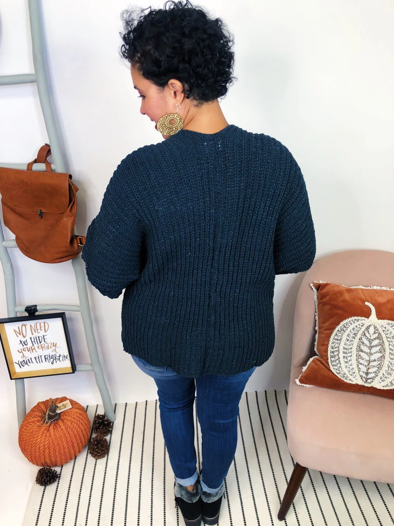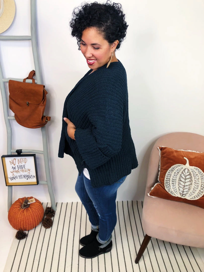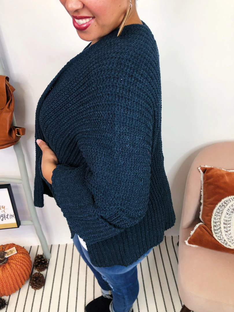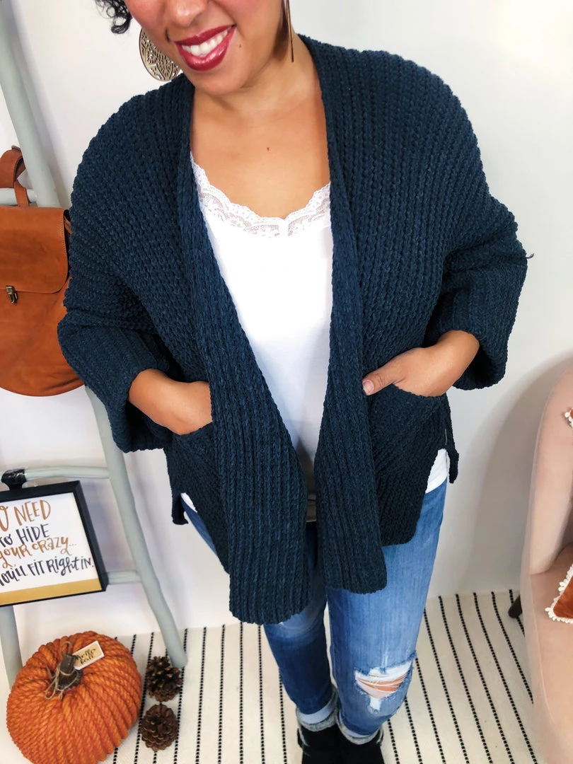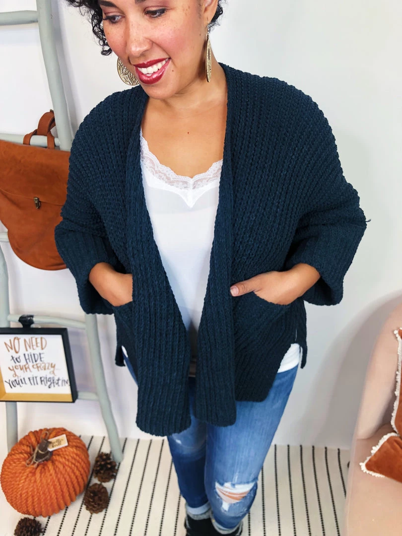 ThisΒ gorgeous short charcoal/navy cardigan it’s going to be your new favorite piece for going out. Beautiful and super comfortable cardigan, it comes with a pocket so you can have your items with you all the time.