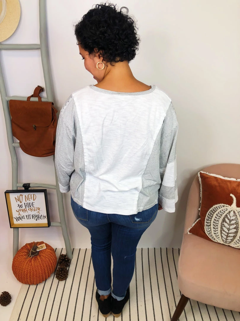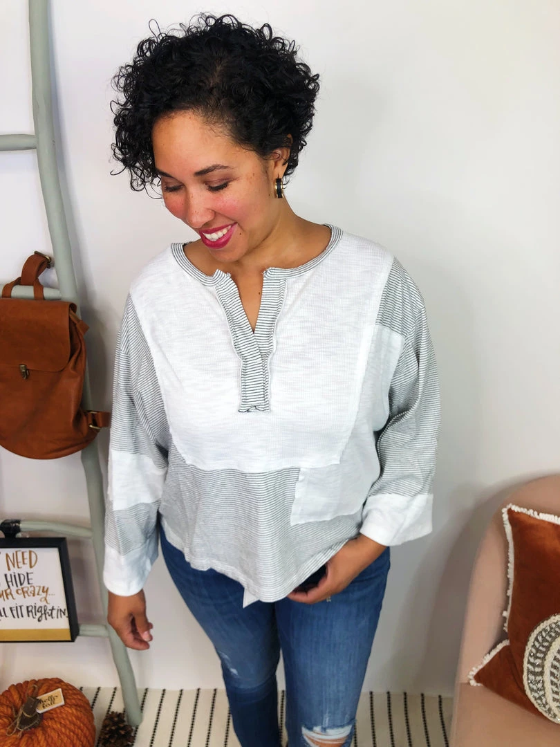 This gorgeous POL top features a patchwork of stripes with a simply white patch. It is relaxed fit with long sleeves and round neckline. There is a slight open detailing on the center front and it is finished with a clean hem. This stunning POL top is unique and effortlessly chic!