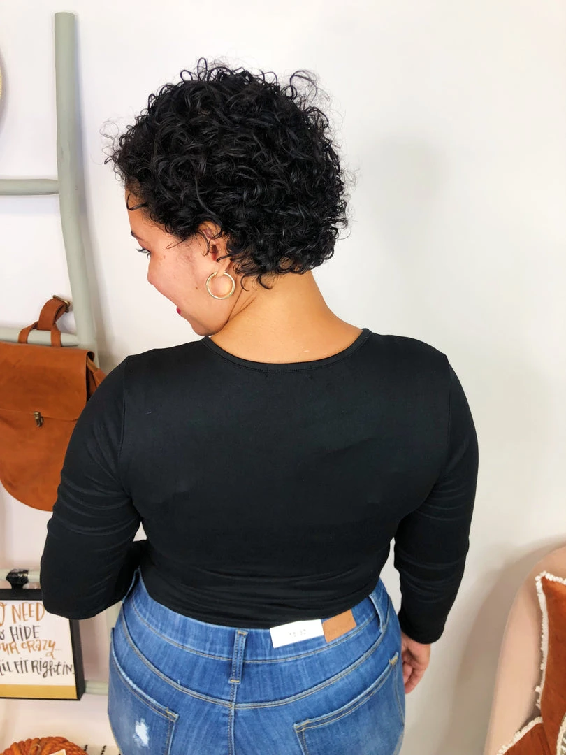 This stunning bodysuit has snap buttons on the front and is made of buttery soft fabric. This long sleeve bodysuit features a round neckline leading into the buttons to help in achieving the perfect fit. This stunning bodysuit snaps at the bottom so you can easily go to the bathroom or remove it if needed.