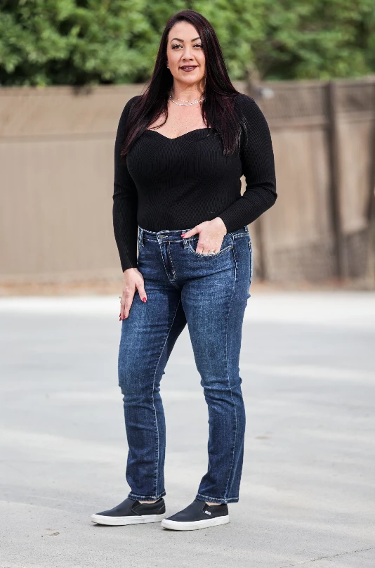 - Callie is 5’8 wearing size 3X (Paired with Classic Straight Leg Judy Blues)