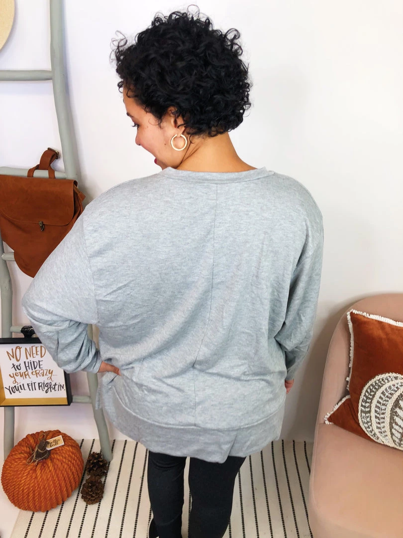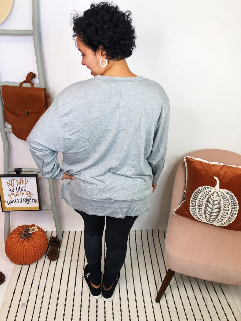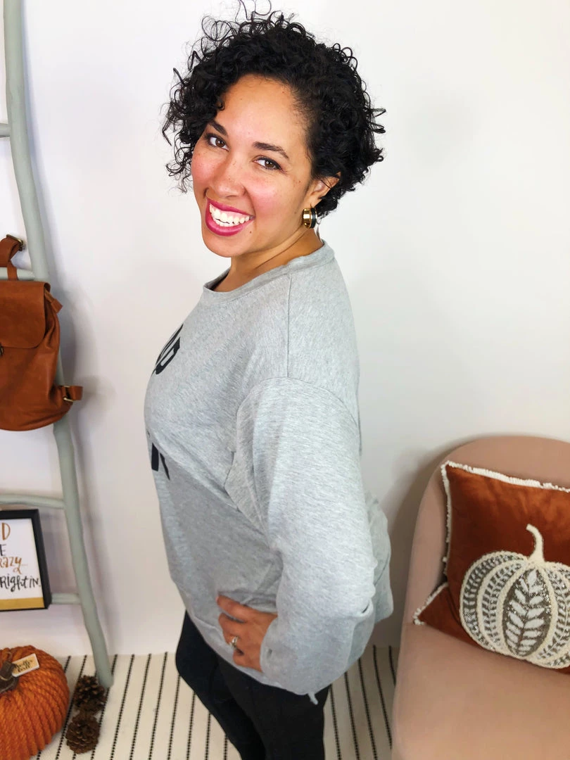 This sweatshirt says “nap queen” on it.This heather grey sweatshirt has a crew neckline and french terry on the inner lining and slits on the sides for best fit. It is so soft and comfy, you will never want to take this off!