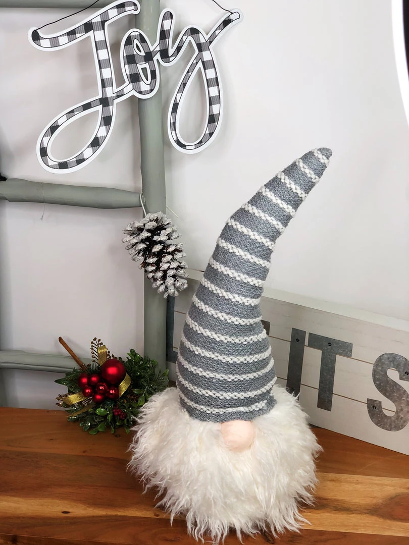 This adorable Santa gnome has a grey striped hat and a light up LED nose. The fluffy beard and absolutely adorable look of this gnome makes it the perfect accessory for any space!