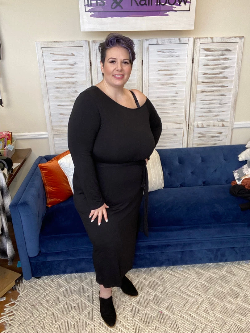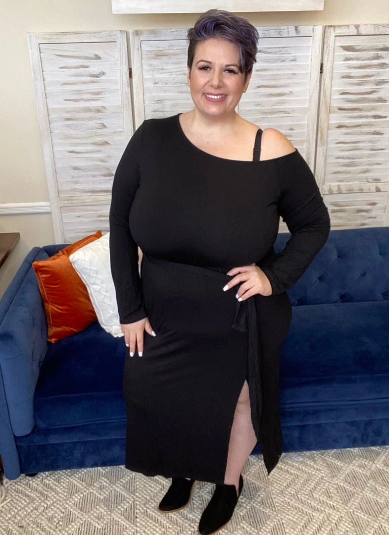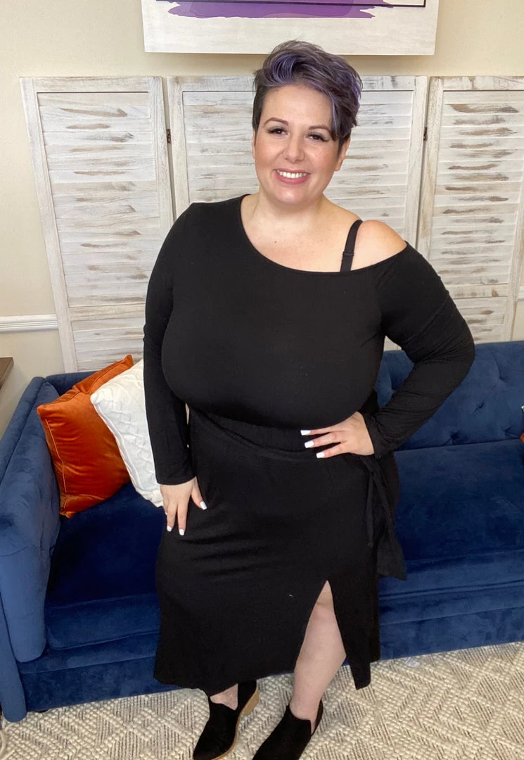 This gorgeous dress is slightly off shoulder with a side slit up the side. It features an elastic waist and an adjustable self tie belt to help you achieve the perfect fit. Super soft and stretchy, this stunning dress is perfection personified!