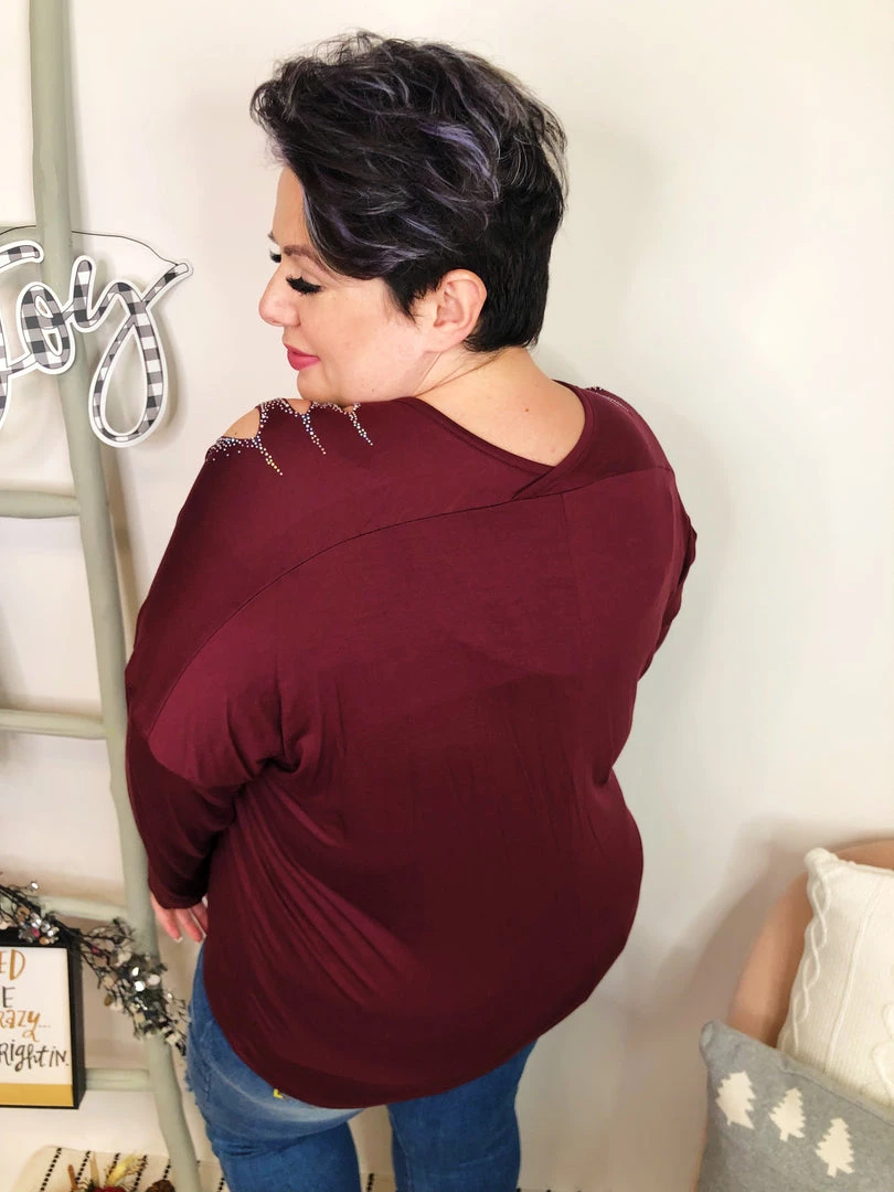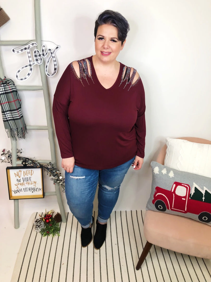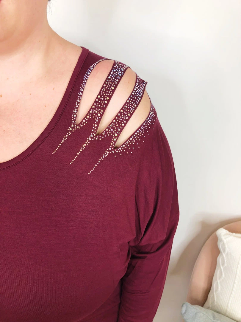 This gorgeous VOCAL top has rhinestones on the shoulders with laser cut slashes on them. The neckline is crew-neck so you have the perfect balance of edgy and sophistication. This material is so soft and has AMAZING stretch! This top is just like our bestseller top that we are absolutely love so snag this version that is perfect for the cooler months!