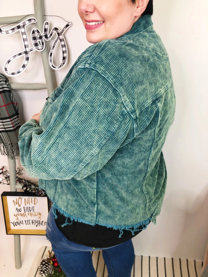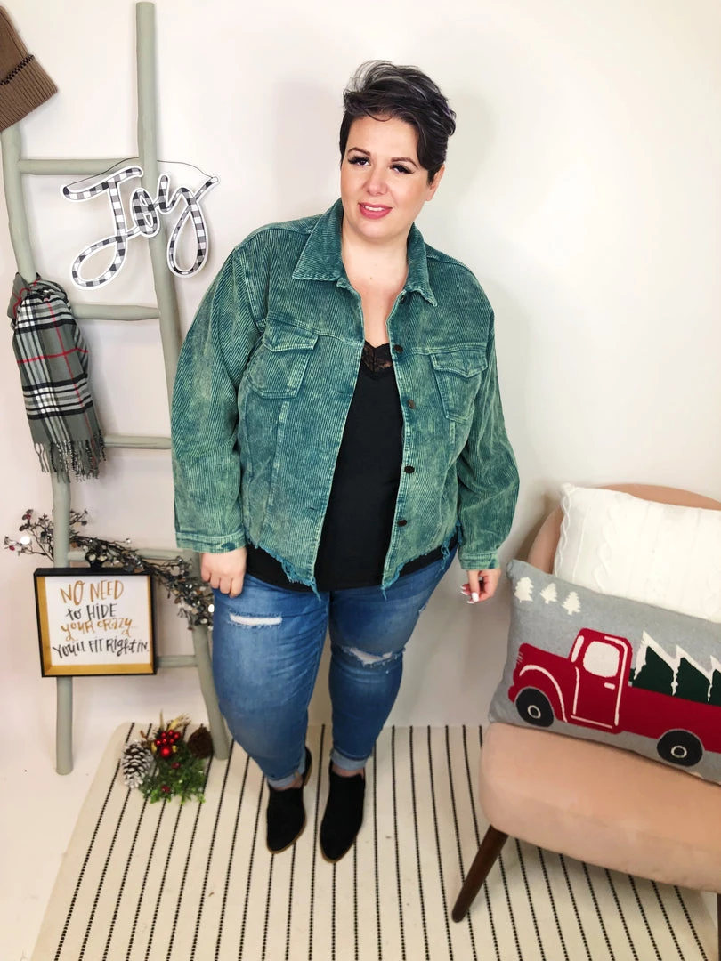 ThisΒ gorgeous faded corduroy POL shacket is so soft!Β It has a beautiful color ofΒ green and features side pocket with cute bottoms! This shacket has a distressing raw hem at the bottom look, which makes even more beautiful!! This amazing shacket isΒ stunning and perfect for fall outfits!