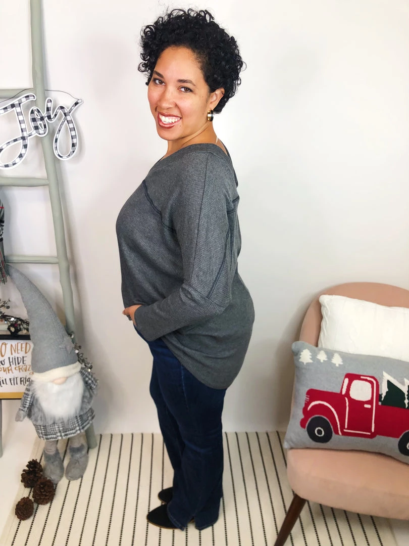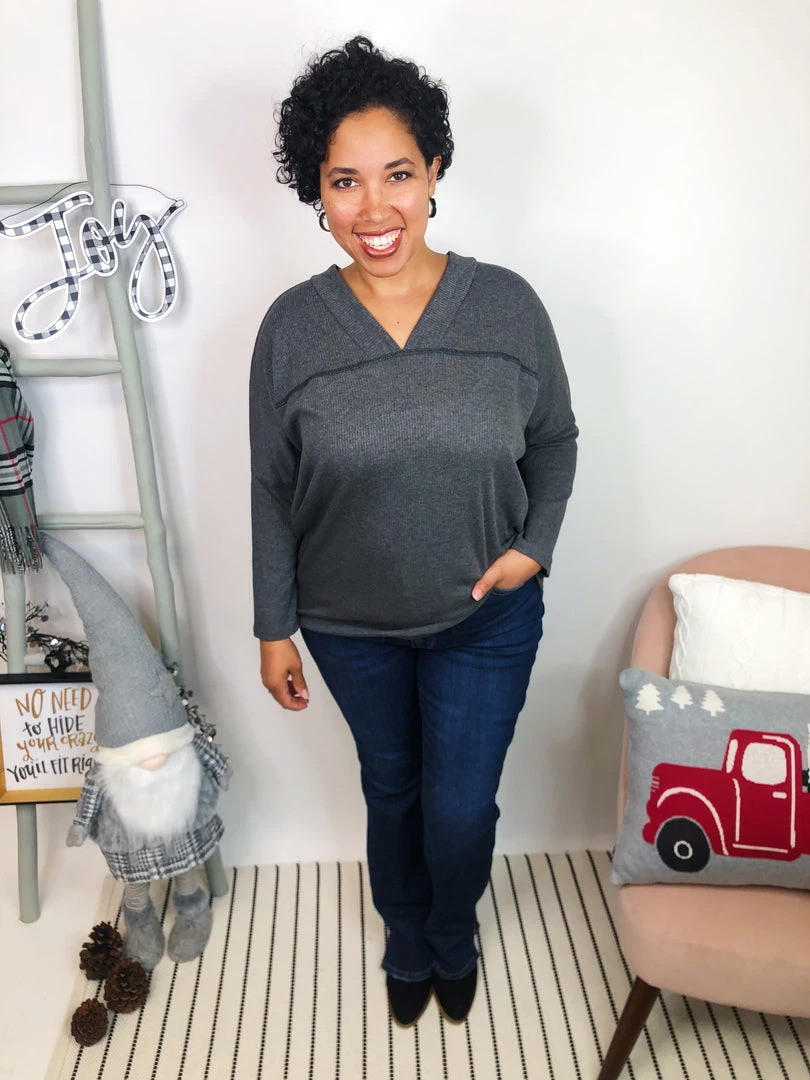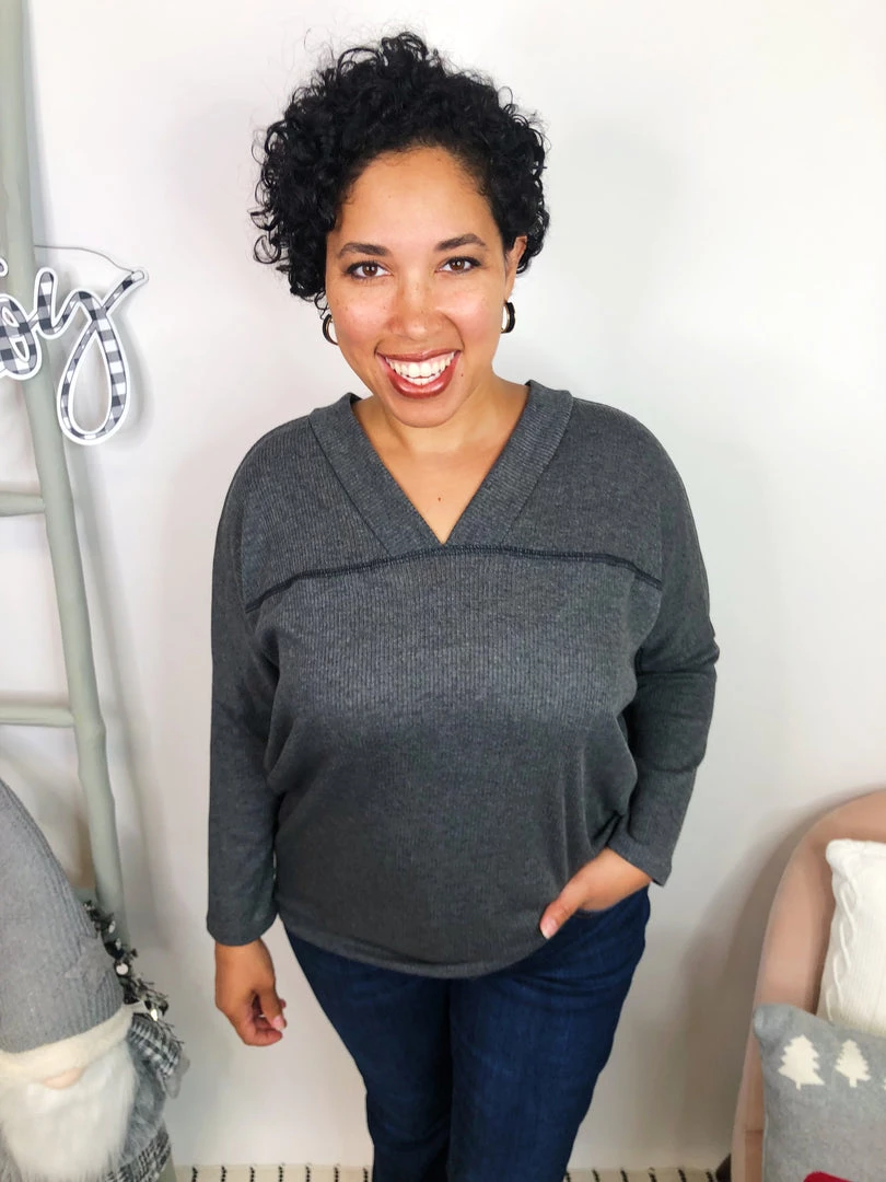 A stunning ribbed v-neck top in a charcoal grey, this dolman style top is so soft and lightweight. With a v-neck on both the front and the back, it has a gorgeous dip that is so flattering, you will love wearing it. The charcoal grey allows you to pair this with whatever bottoms you wish and even layer it! It is so stunning you absolutely NEED this!