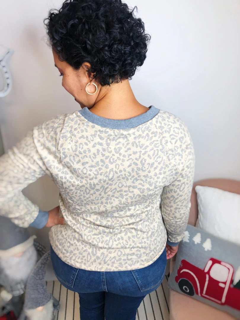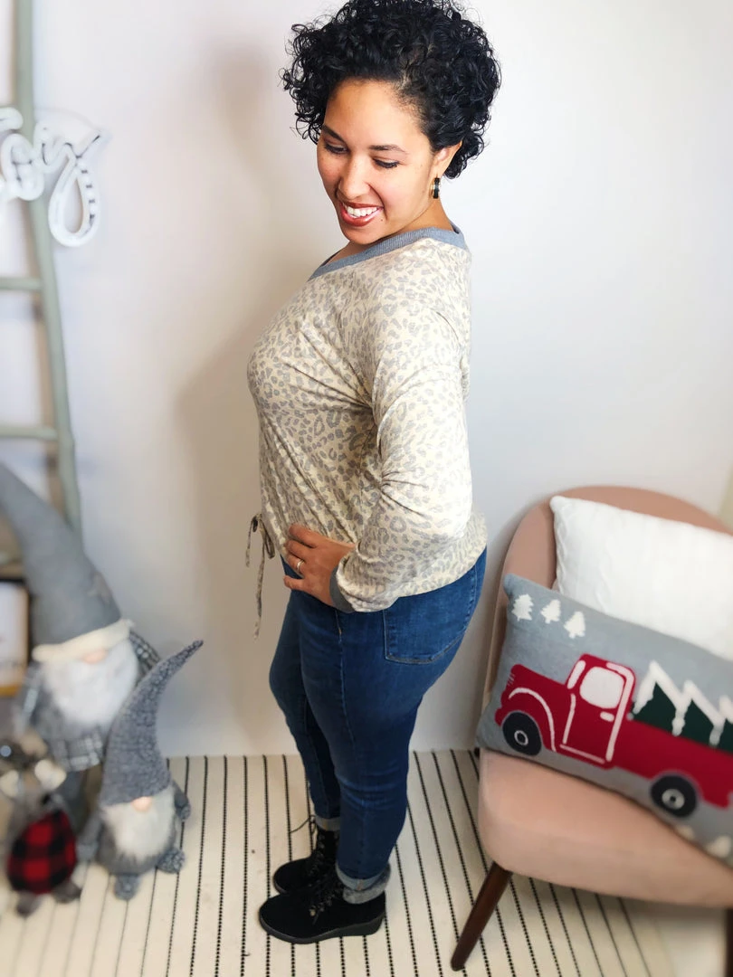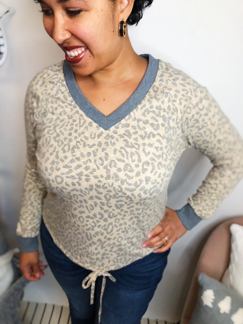 This top is so cute! It has a sand/grey animal print in it. It has a really soft grey V-neck that matches the end of its sleeves! The hem has an adjustable waist line! It is the cutest thing ever! The fabric in this top is incredible lightweight and soft! You’re going to feel so cozy wearing it!Β