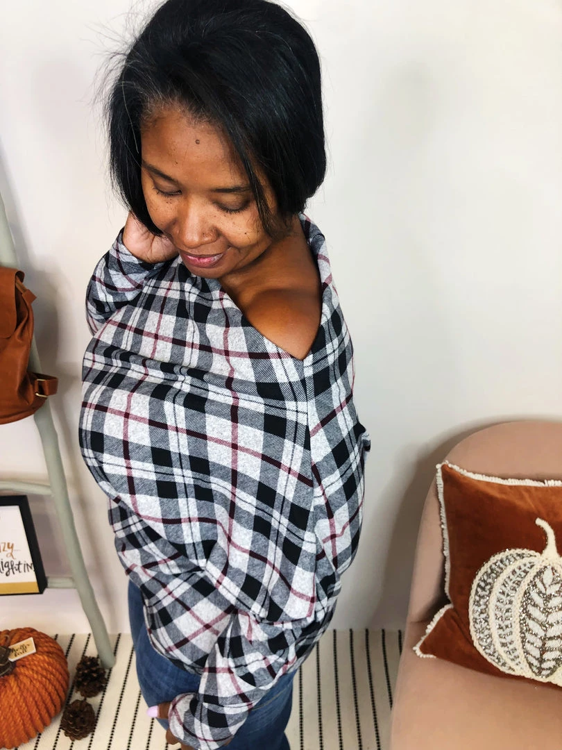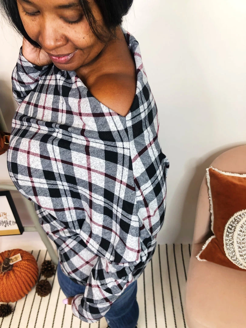 This Beautiful Plaid Top is gonna keep you nice and cozy in those cold morning from the fall. It’s a nice stretchy top and very light, it has a plaid on charcoal and black with some red stripes going though it.Β