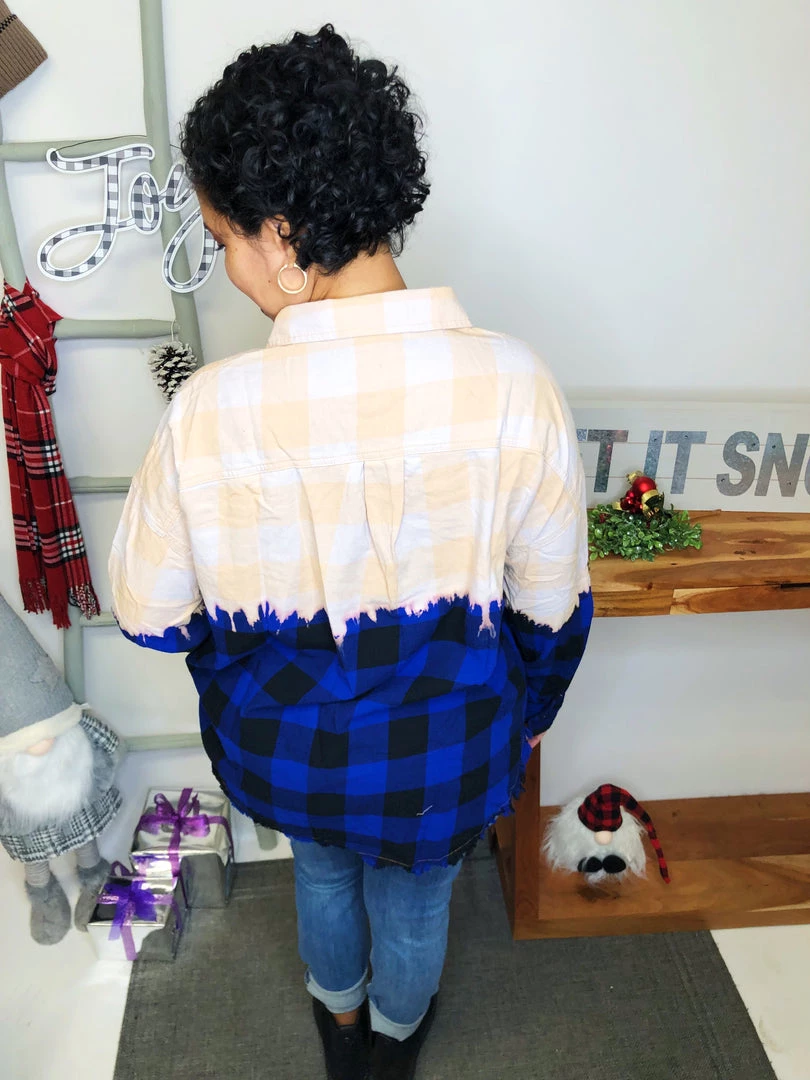 Bottom of the shirt is vibrantΒ blue plaid, the top part is bleached.Β