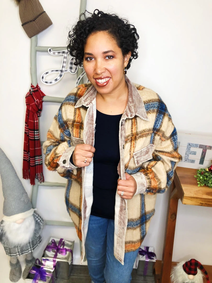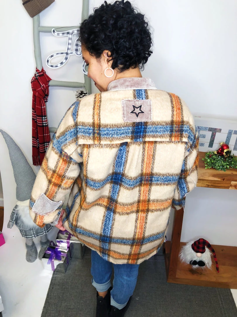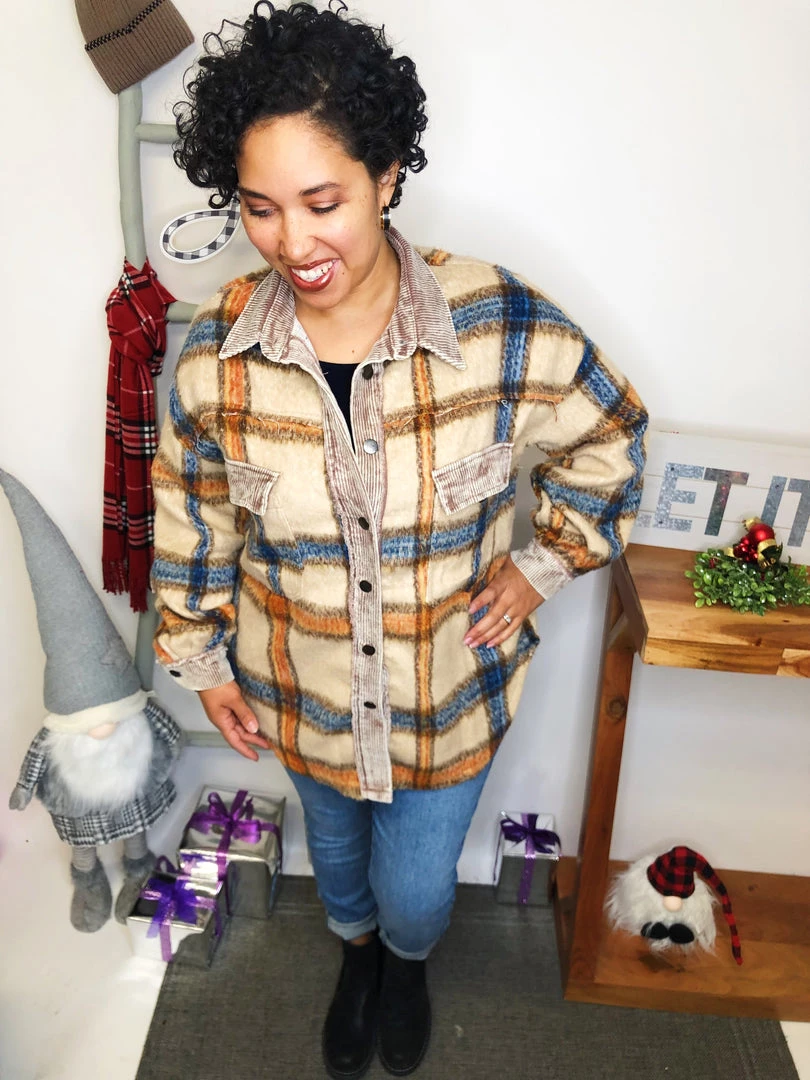 ThisΒ amazing POL shacket is stunning!! The plaid color in beige, orange, brown and blue makes this shacket perfect for any outfit! It has a corduroy detail on the collar, pockets and on the elbow side.Β Stay warm and cozy with this stylish piece!!