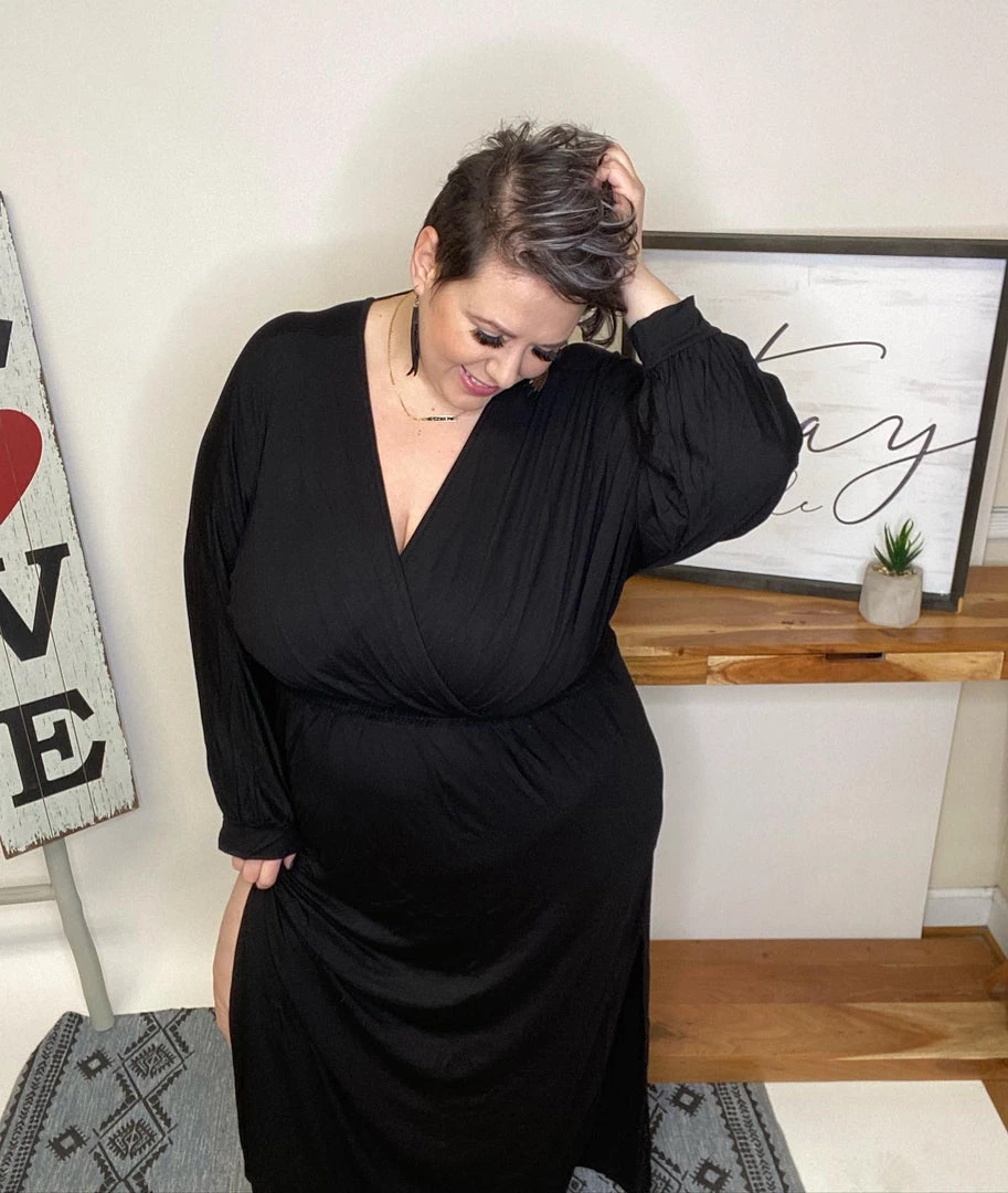 This gorgeous long sleeve maxi dress features a wrapped look in the upper chest and a smocked waist. It has two high side slits that give this dress a sexy edgy. This dress has incredibly stretch and is so incredibly soft, you will never want to take it off!