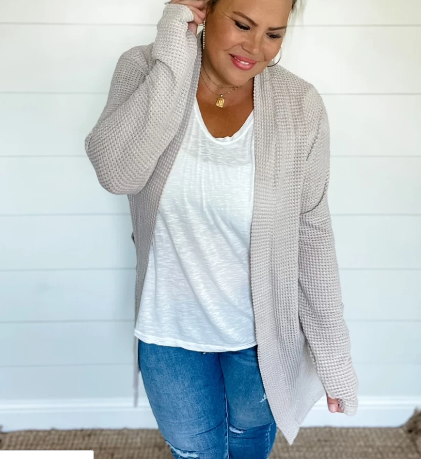 This cardigan is SO beautiful! It’s definitely the kind of piece that goes well with everything! It has great front pockets and an adorable waffle knit fabric featuring thumbhole cuffs! And this cardigan is so lightweight and soft that you’ll never want to take it off! You’re gonna love this!Β