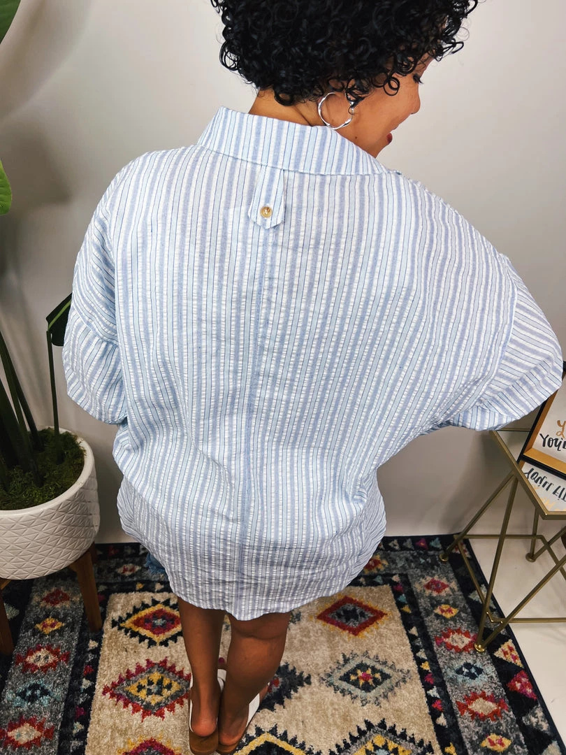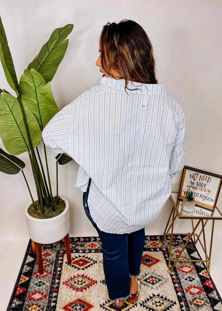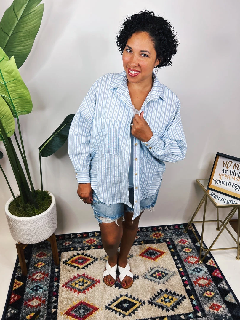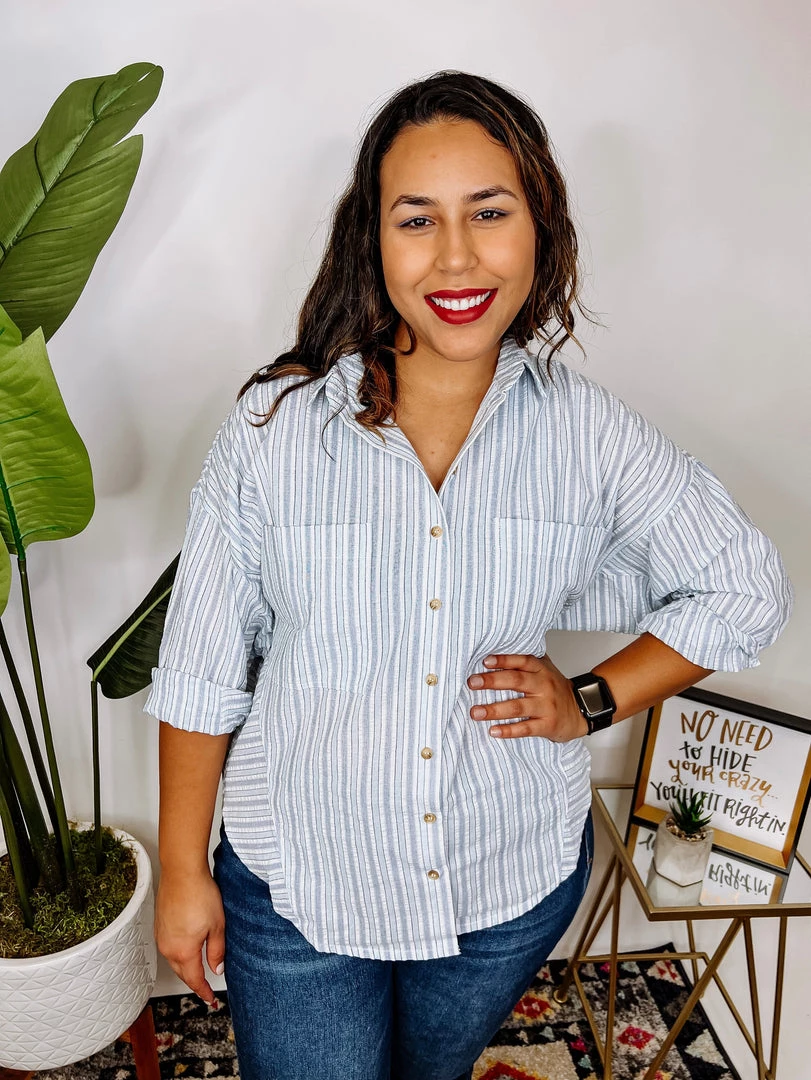 This multi stripe woven shirt has loose fit, collared with button down closure, chest pockets, round side slits and long cuffed sleeves!!! That’s such a elegant piece and cool piece to make any outfit looking amazing! You’re gonna love it!!!