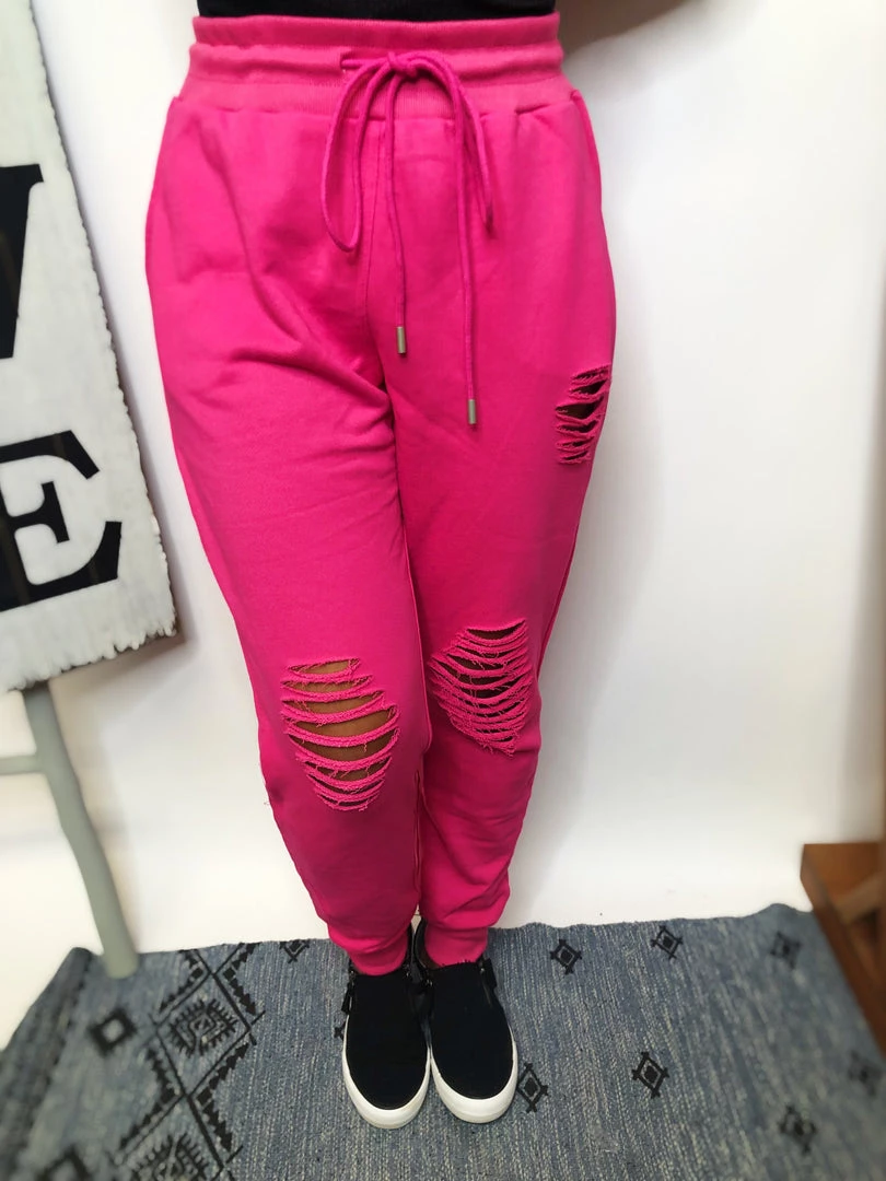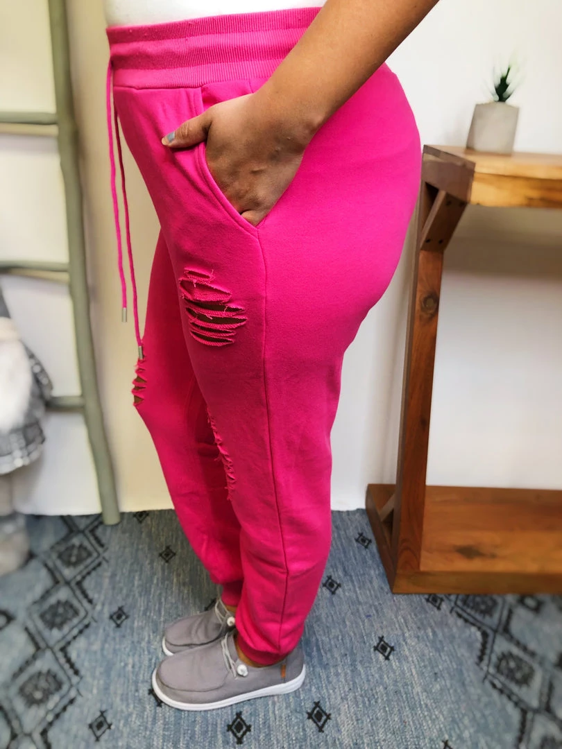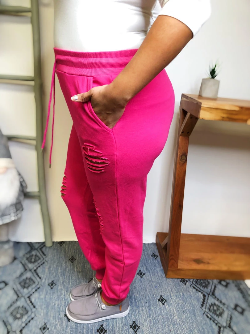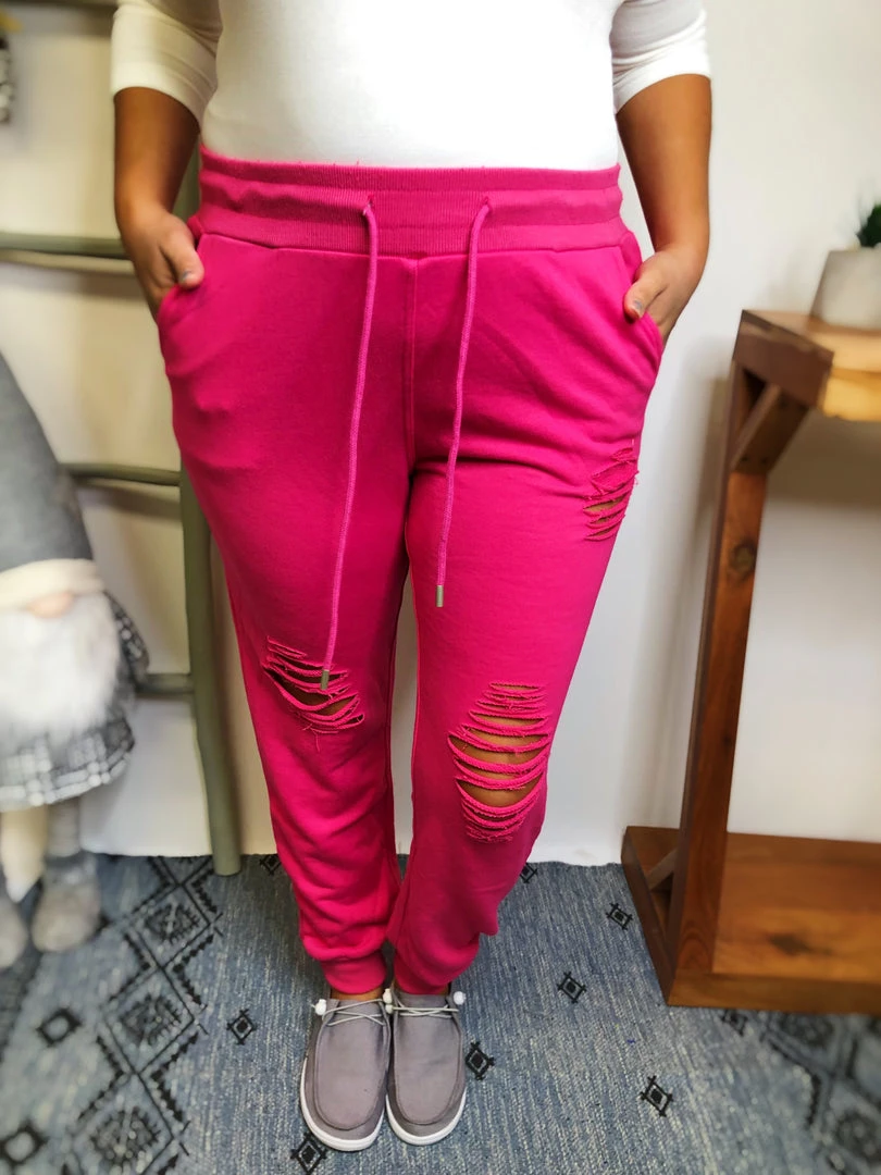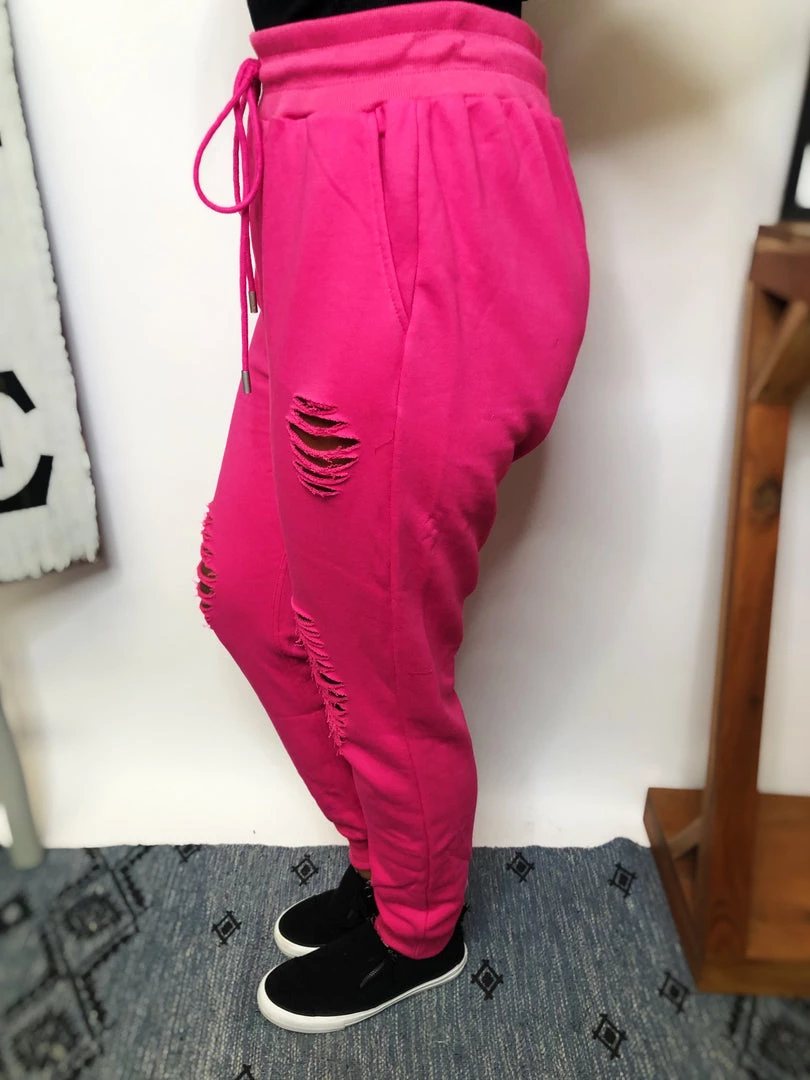 These incredible joggers inΒ Hot Pink, are just amazing! It feature some distressed slashes on them on the knees and thighs. These over sized joggers are really soft and comfortable, you will never want to take them off! The drawstring on these allows to adjust these for the perfect fit. Pair these with your favorite comfy top for an amazing outfit!