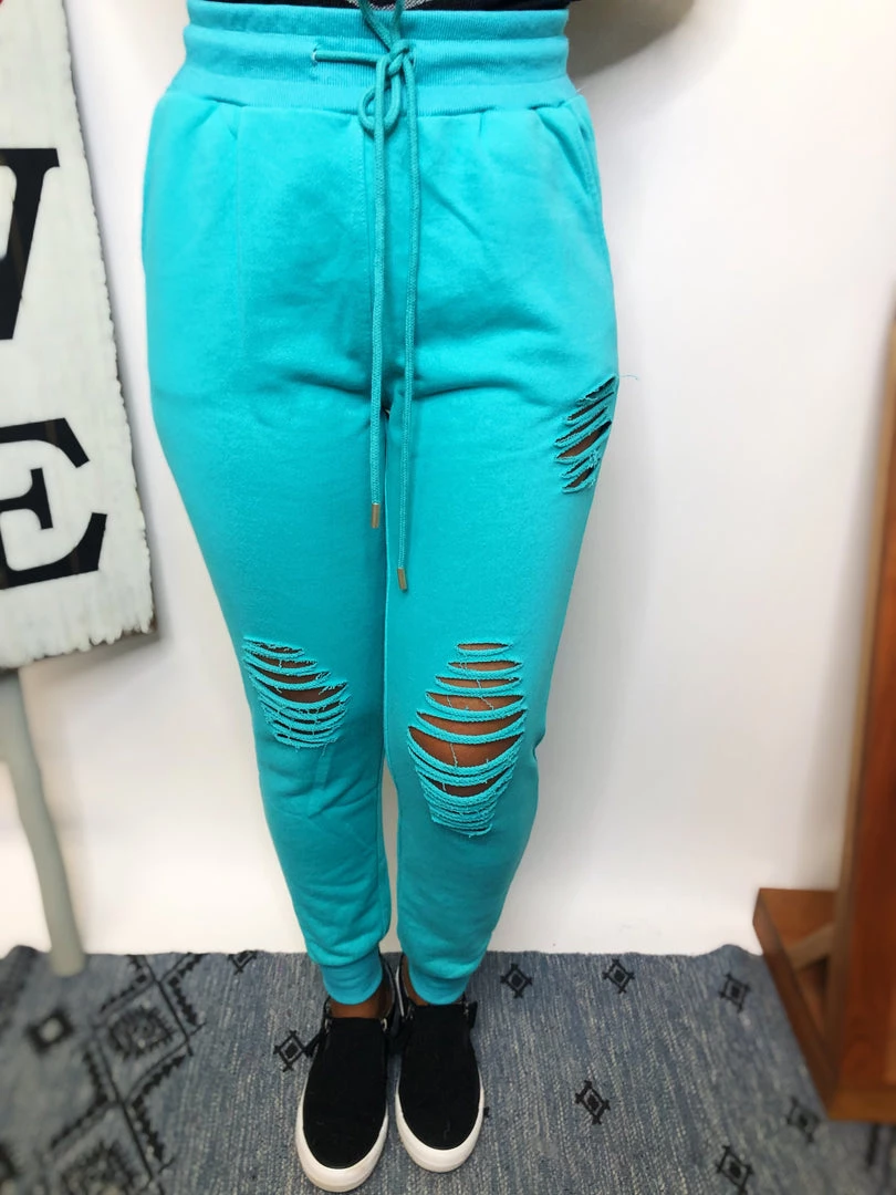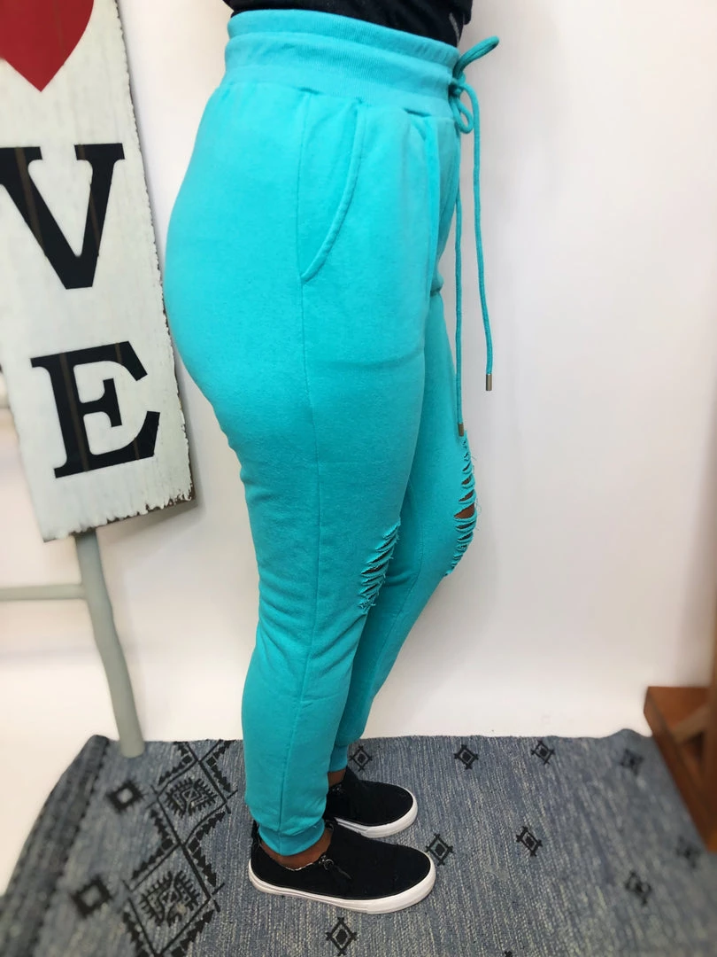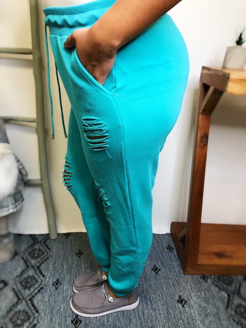 These amazing Seafoam colorway joggers are everything you need! It feature some distressed details on the knees and thighs. They are over sized joggers and really soft!Β The drawstring allows you to adjust them for the perfect fit. Pair it with your favoriteΒ top for a super cute and comfortable outfit!