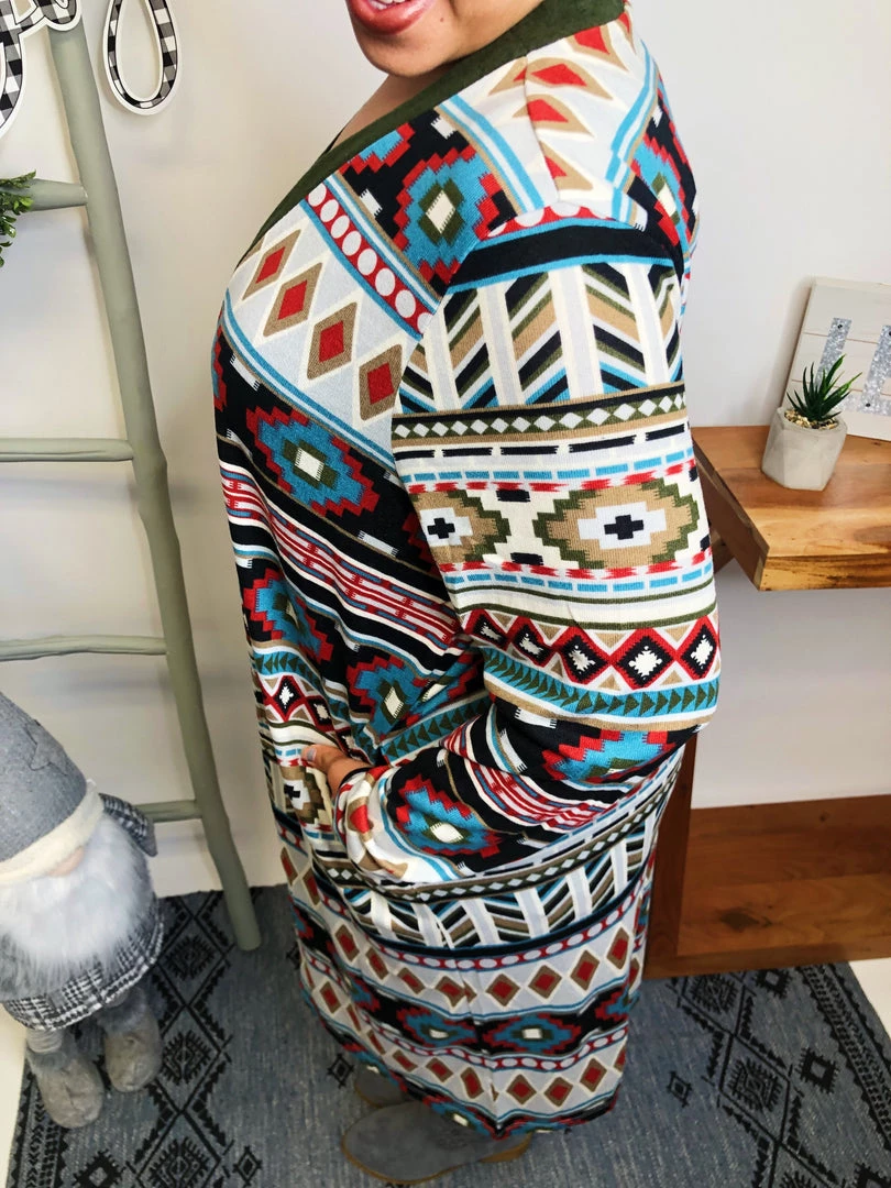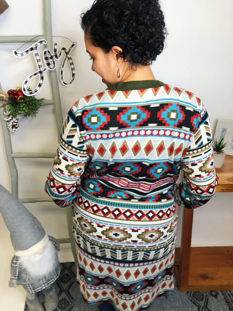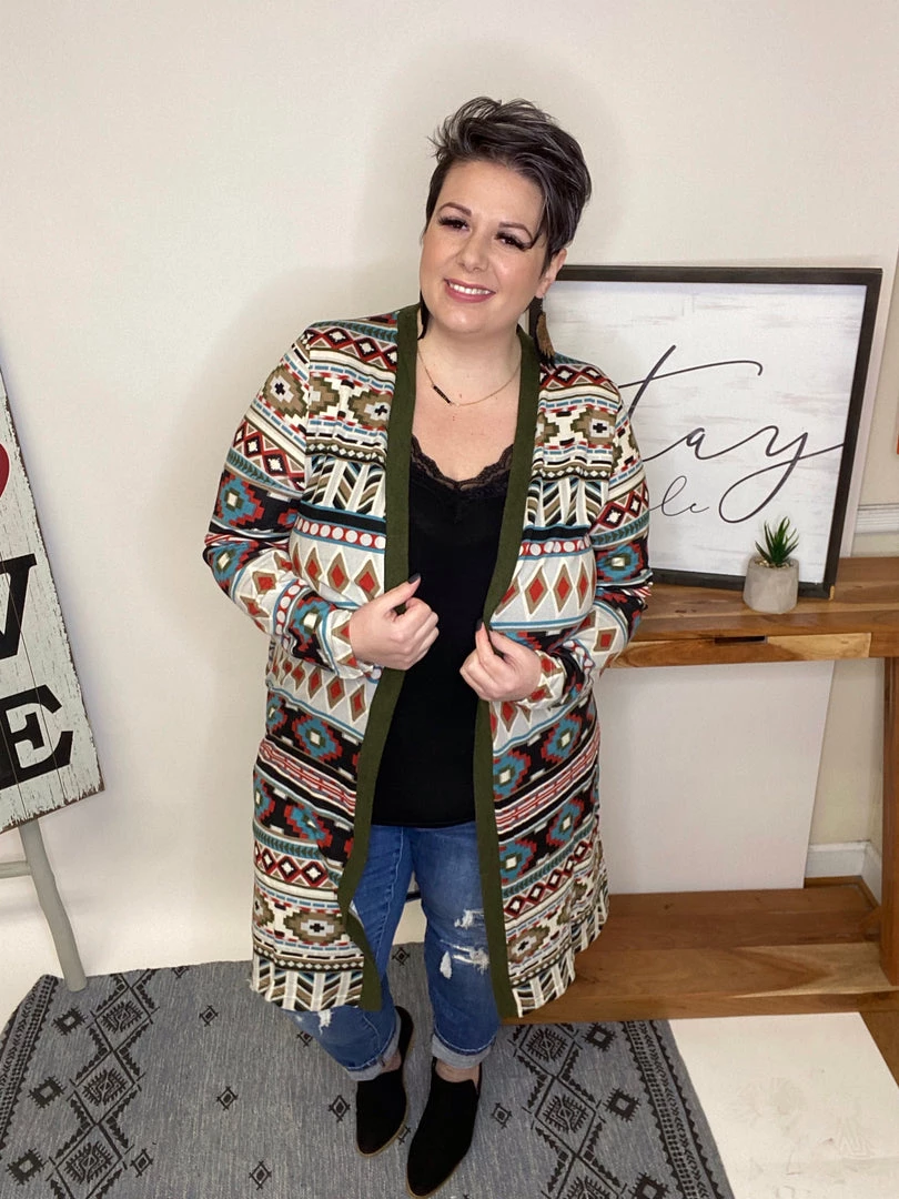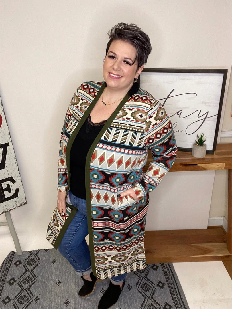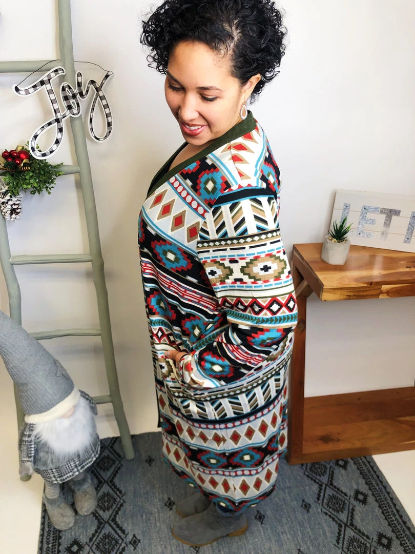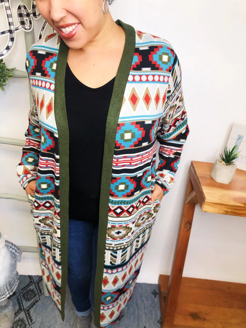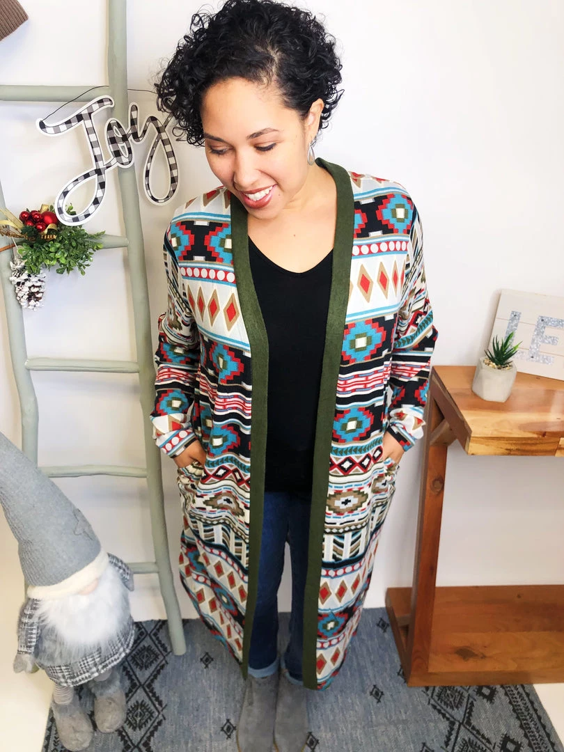 This aztec print cardigan is GORGEOUS! It has such a beautiful pattern and amazing colors! It has great pockets and long sleeves! And the fabric in this cardigan is really lightweight and soft! You’re gonna love owning this!
