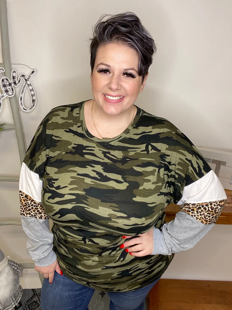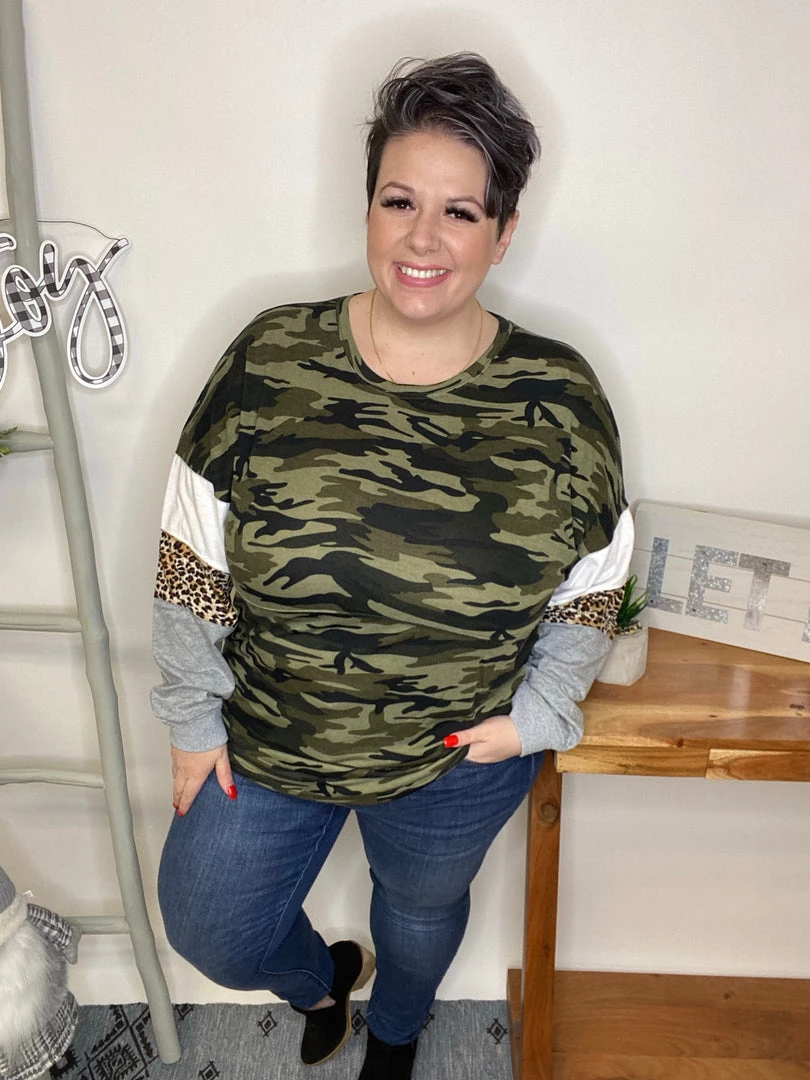 This top is a beautiful mix of camo and leopard prints! It has long sleeves and a round neck.Β It can be worn all year around! And the fabric in this top is really lightweight and soft! You’re gonna love it!Β