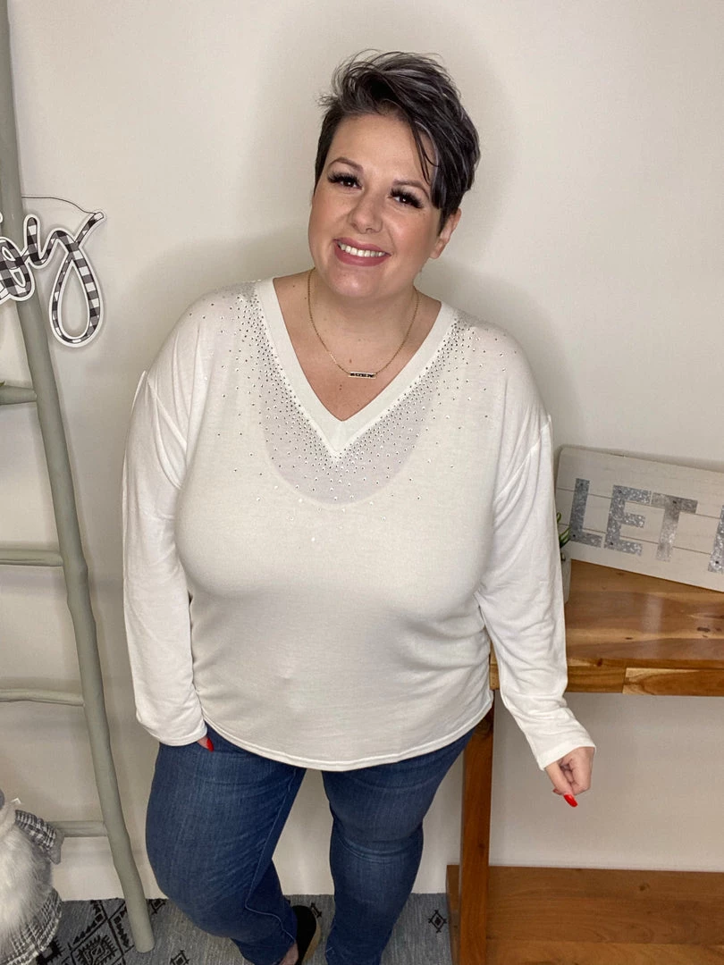 This gorgeous VOCAL top is perfect! It has a V-neck andΒ rhinestones on it!! This tops is so beautiful, it’s perfect for your night out. You will love this top!